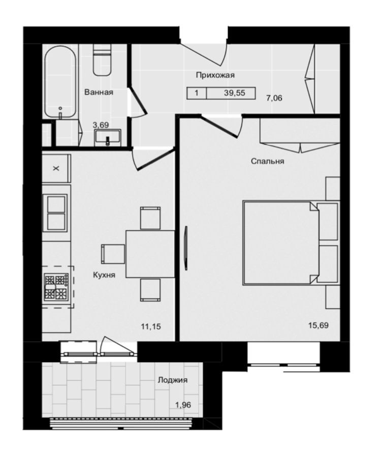 8/9 этаж, общая площадь 39,55 м2, жилая 15,69 м2, кухня 11,15 м2