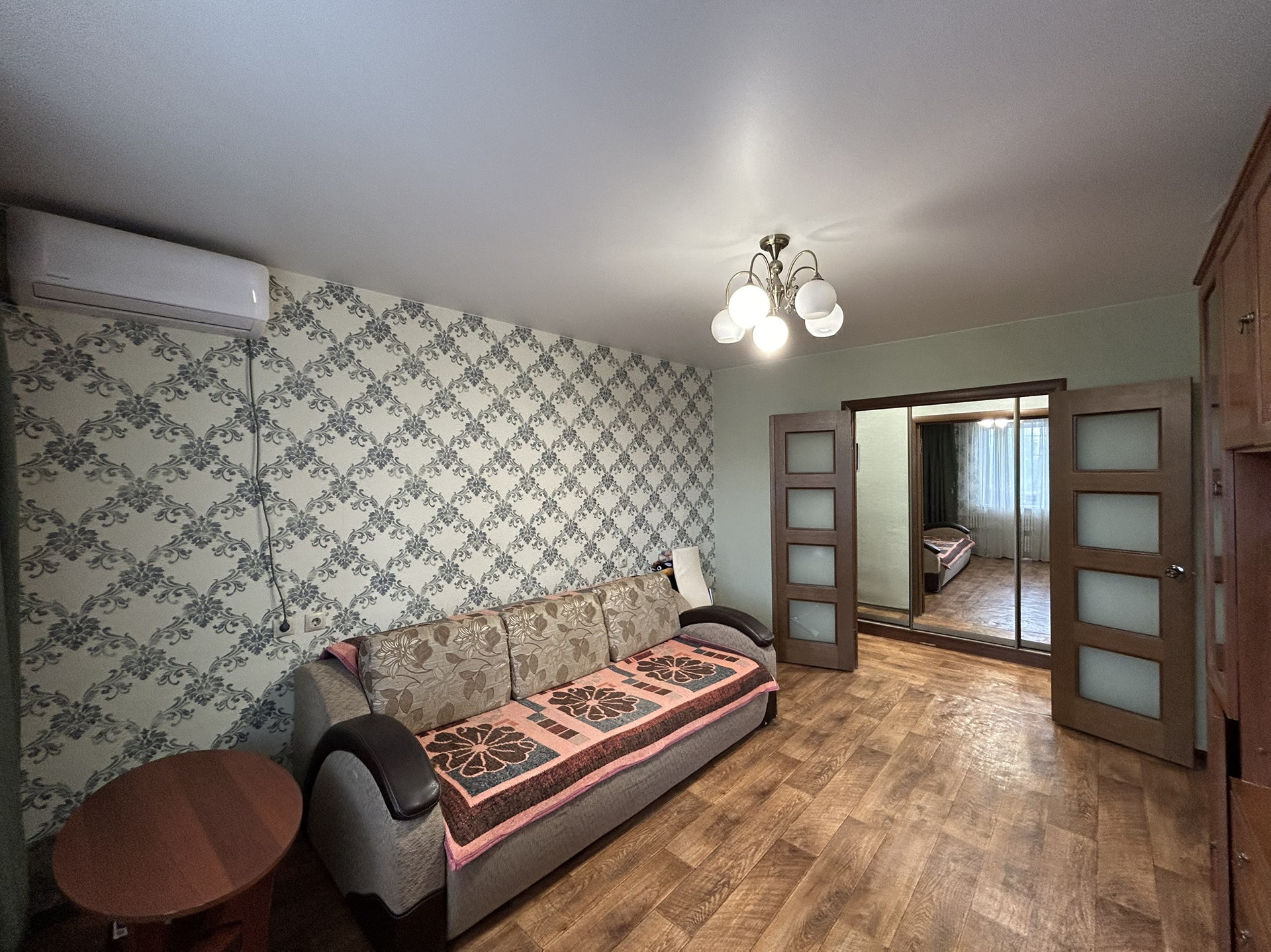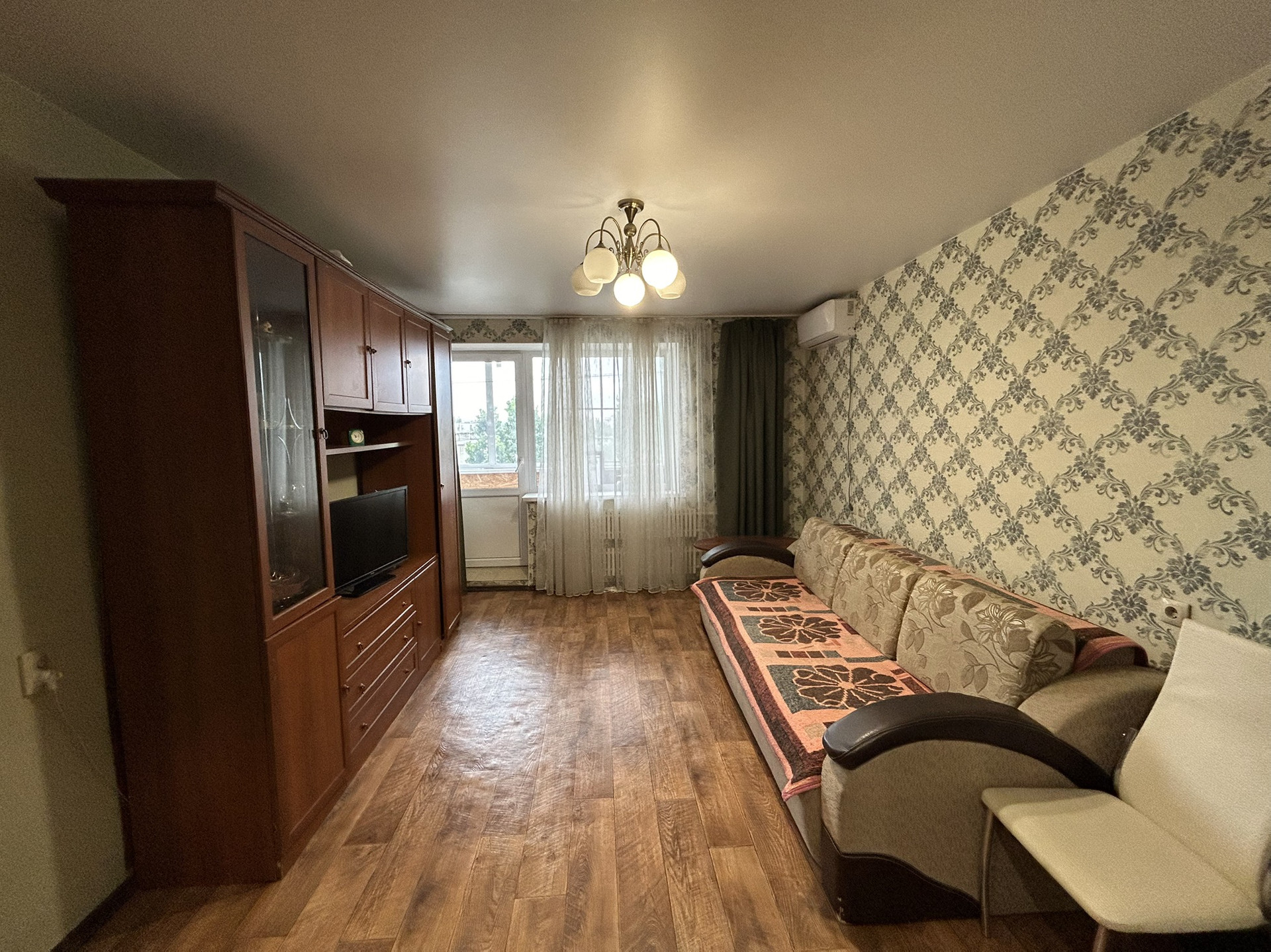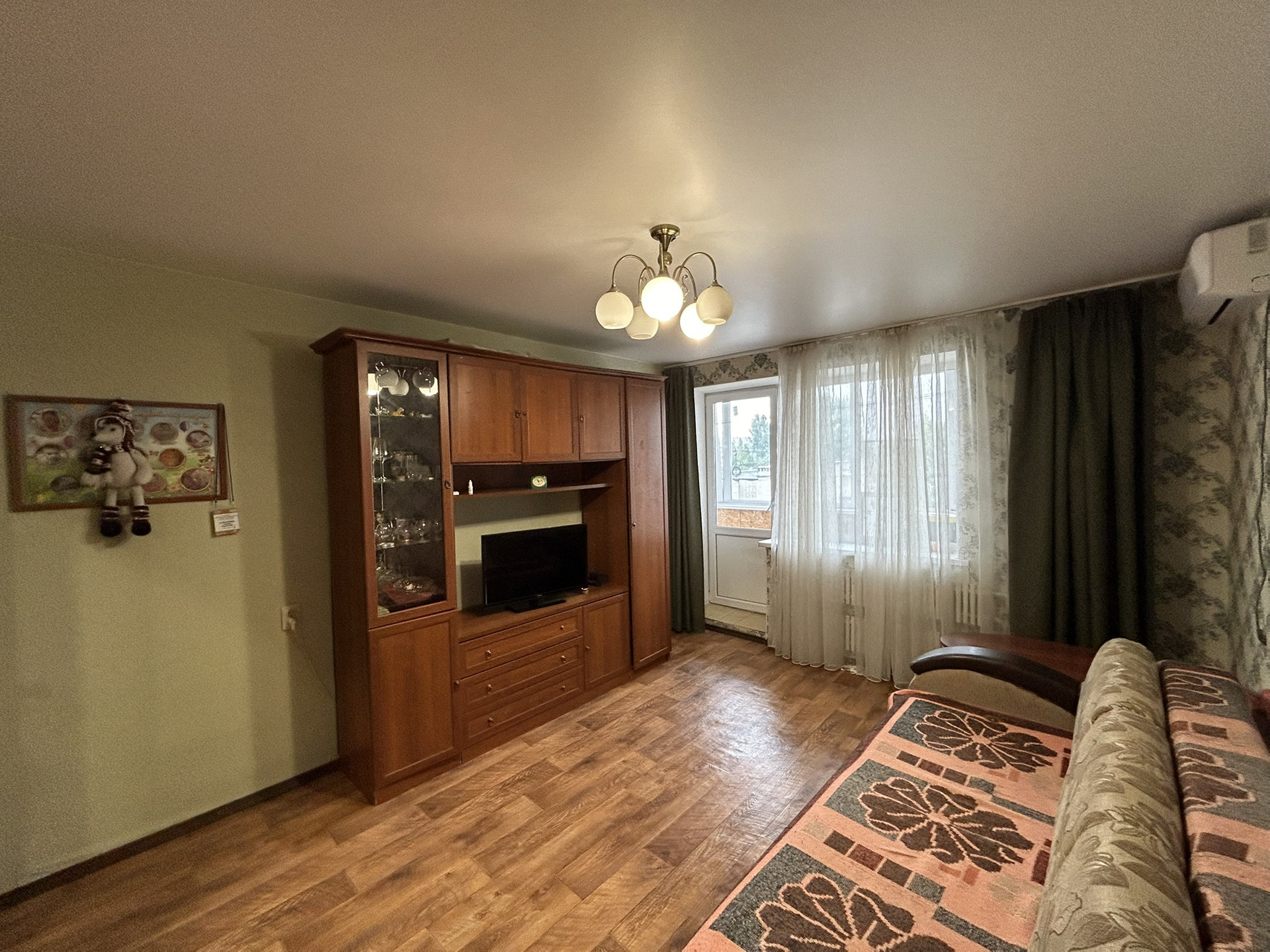 В квартире остается кухонный гарнитур, встроенный шкафы купе, в гостиной стенка и диван, сплит система.