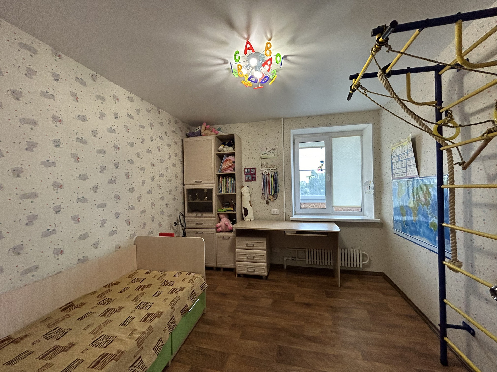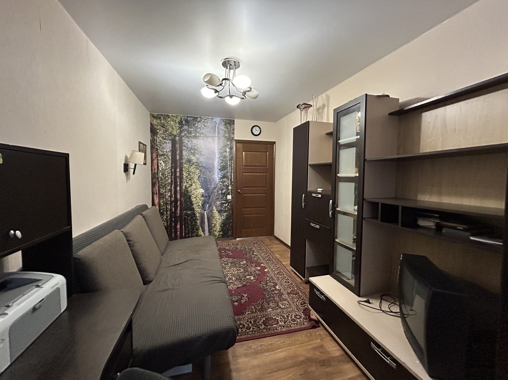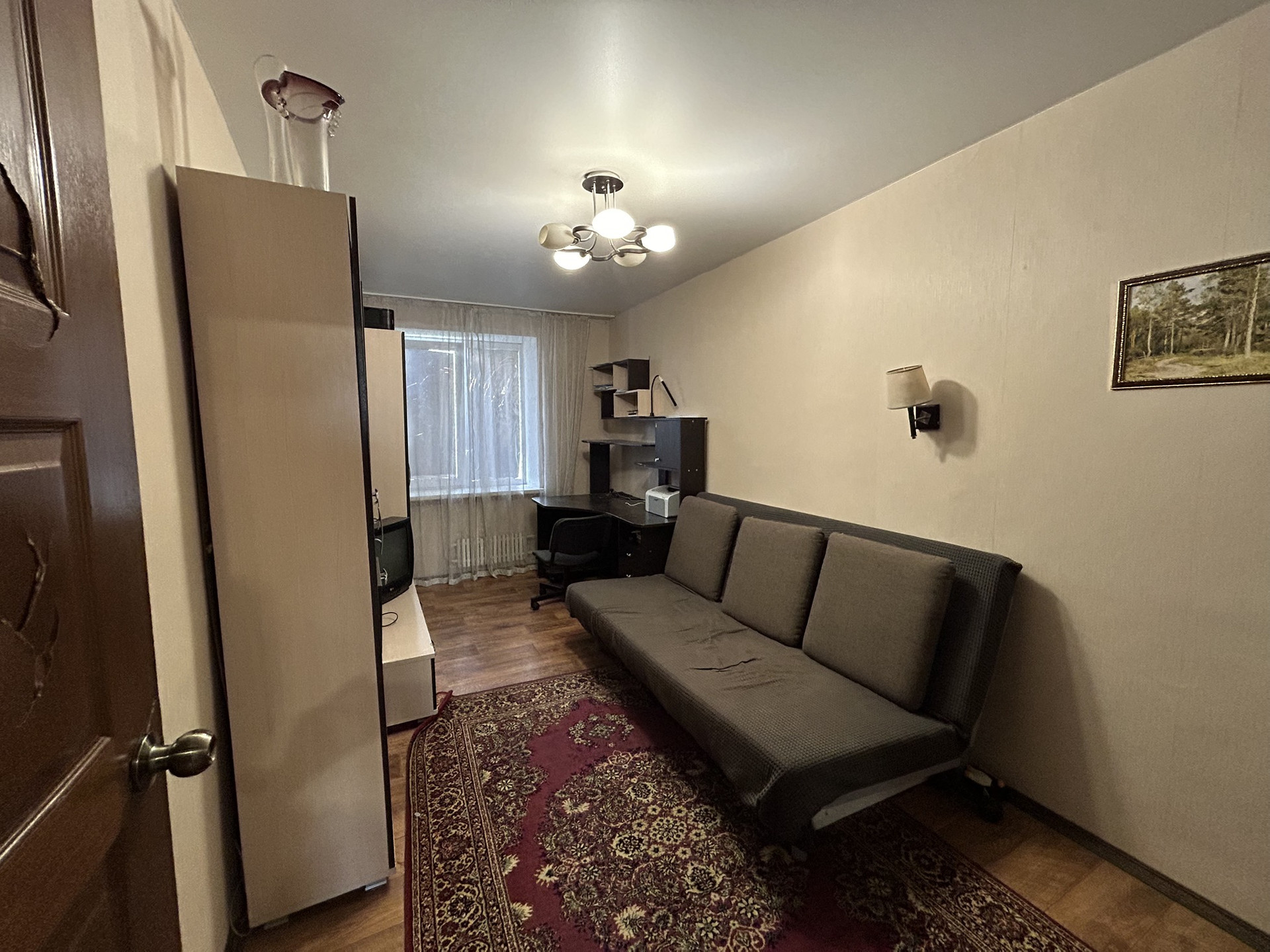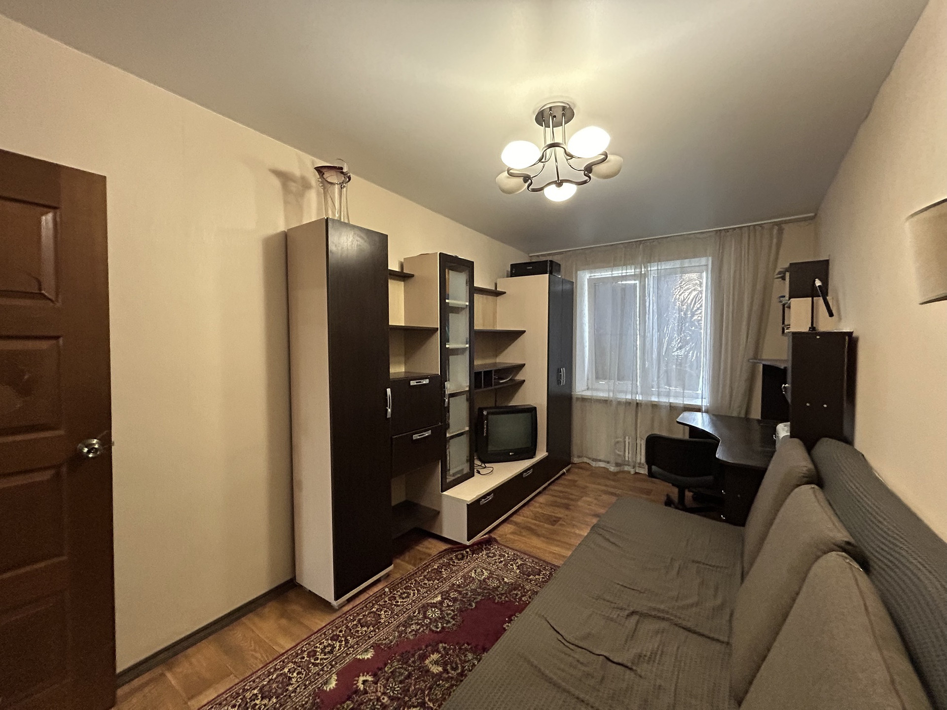 В квартире остается кухонный гарнитур, встроенный шкафы купе, в гостиной стенка и диван, сплит система.