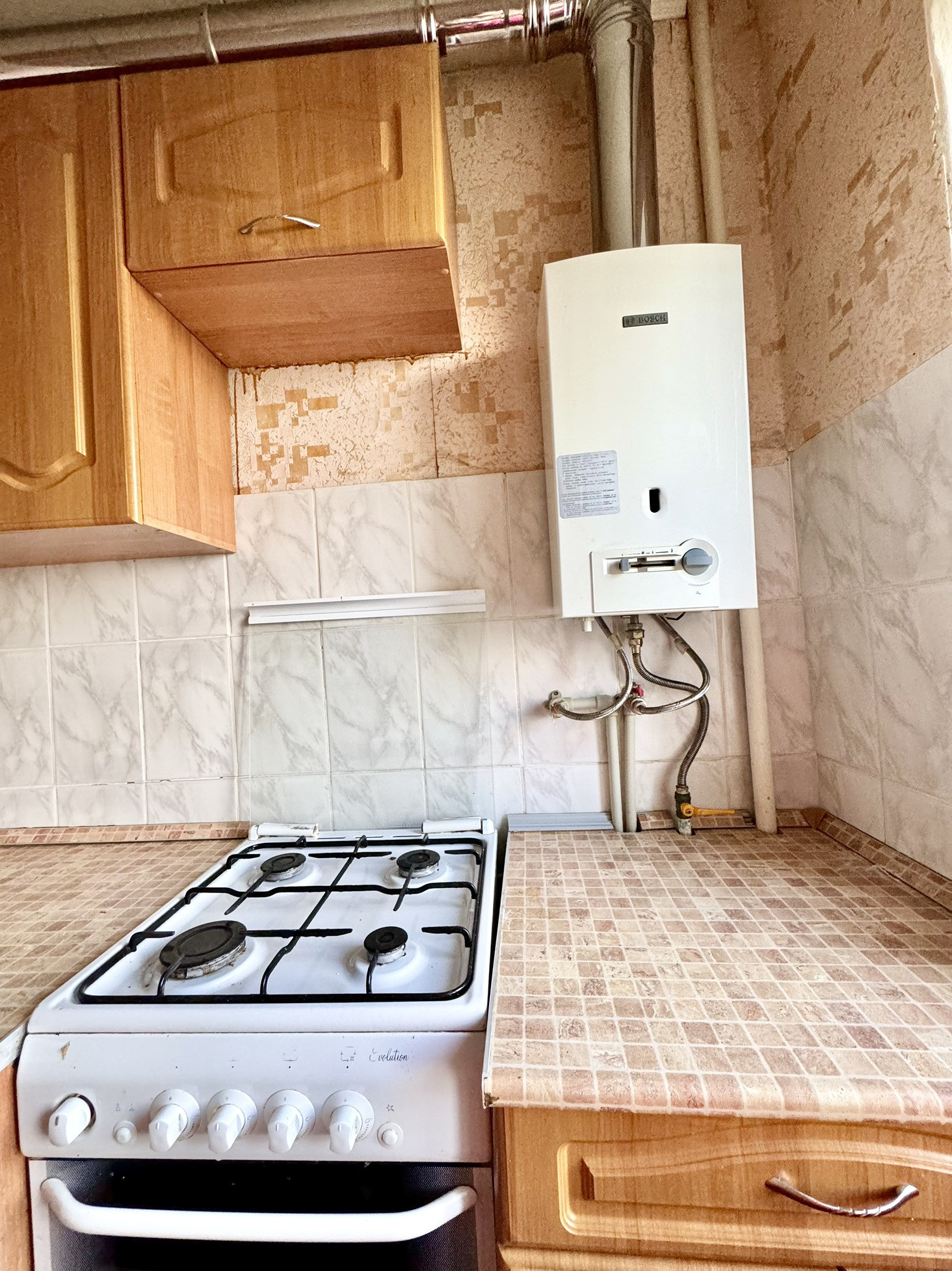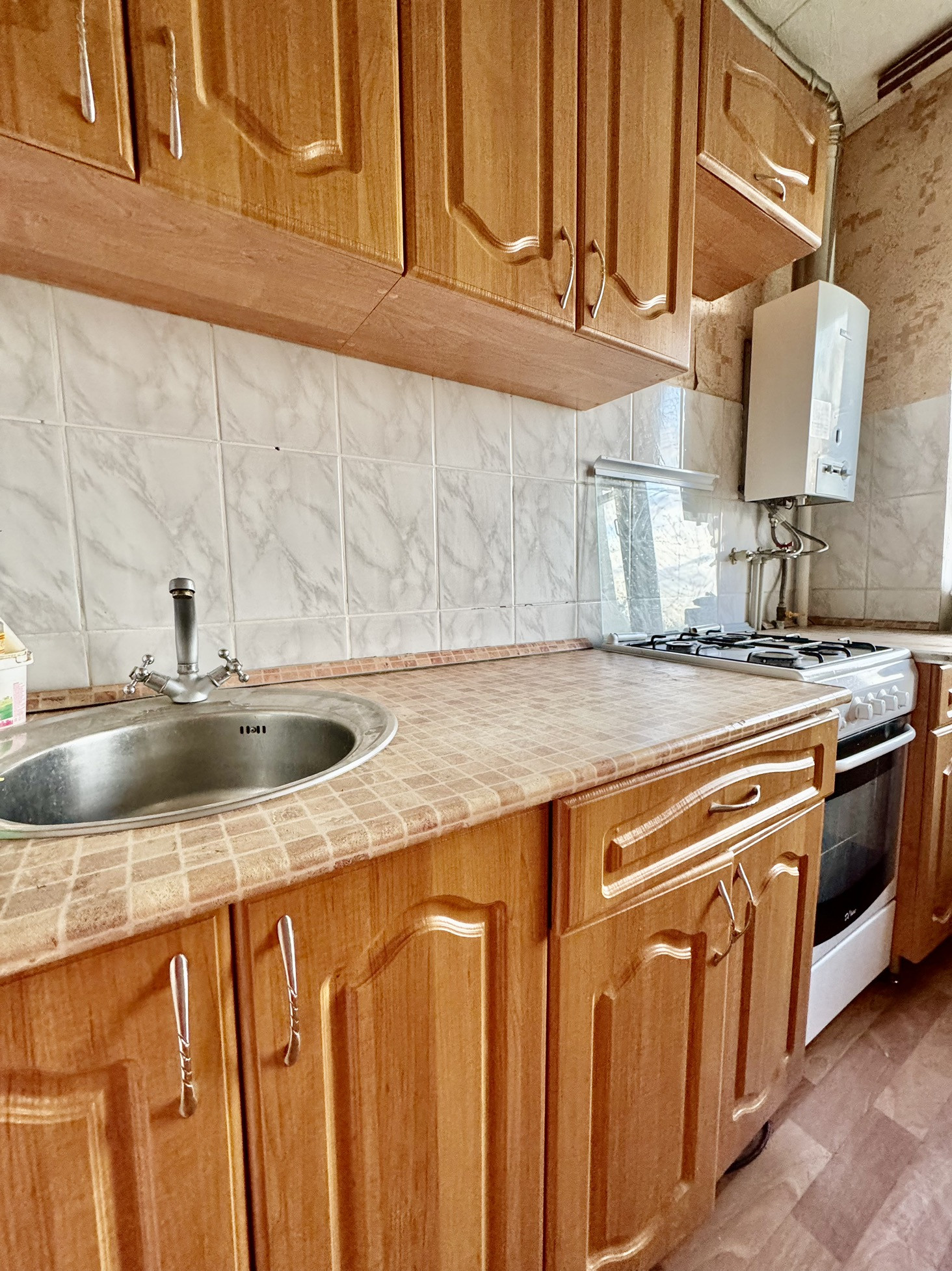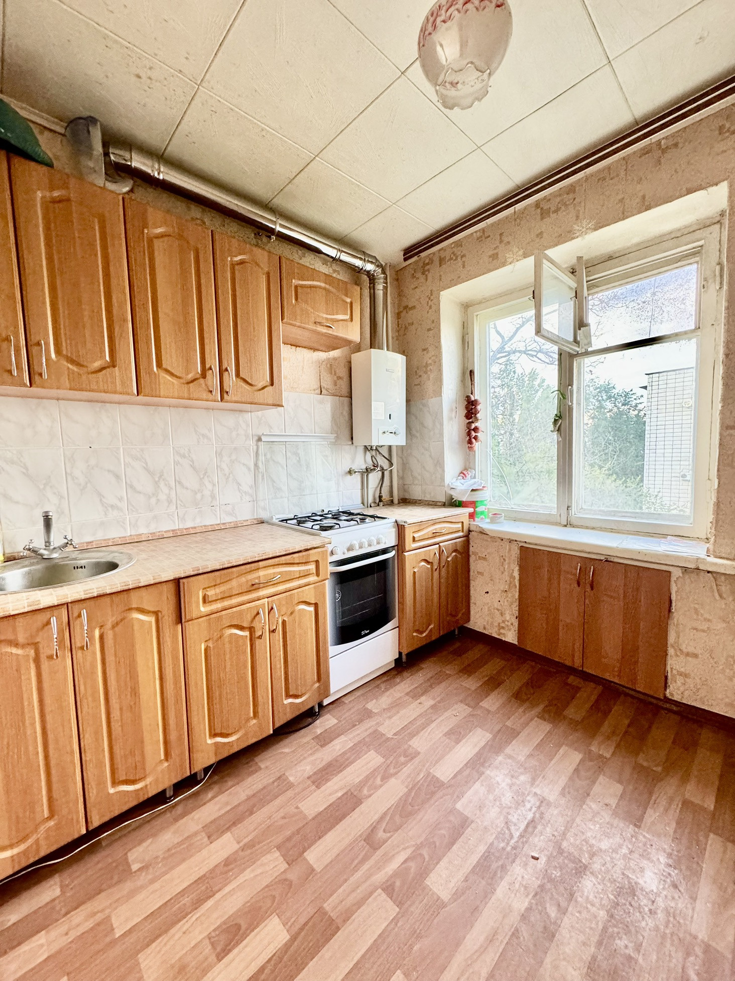 Остается кухонный гарнитур. Сплит система. Новая колонка автомат Bosh с подведенной новой вентиляцией, газовая плита в хорошем состоянии, пластик окна.