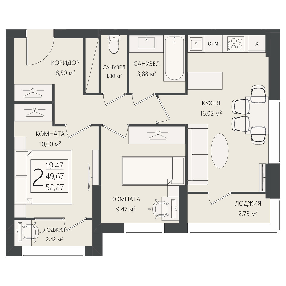 Общая площадь 52.27 м2