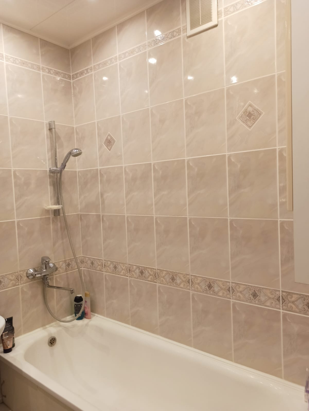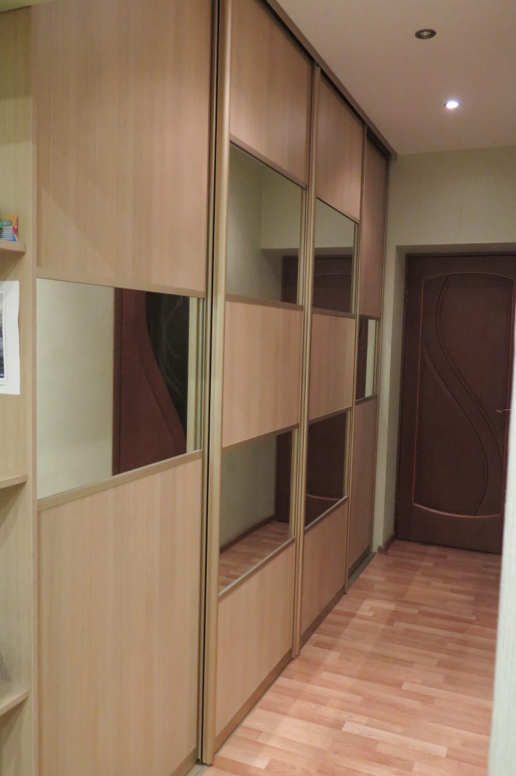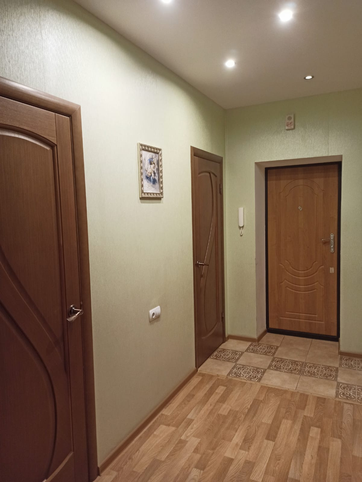 В коридоре установлен  функциональный шкаф купе длиной 4,5метра, он почти не заметен, не съедает пространство, так удачно грамотно  встроен в проект планировки квартиры. Сан узлы большие, не тесные. Ванна 3.6 кв.м, а  туалет 2.3 кв м. Стены и полы облицовочны  кафелем  и керамогранитом естественных природных мягких оттенков.