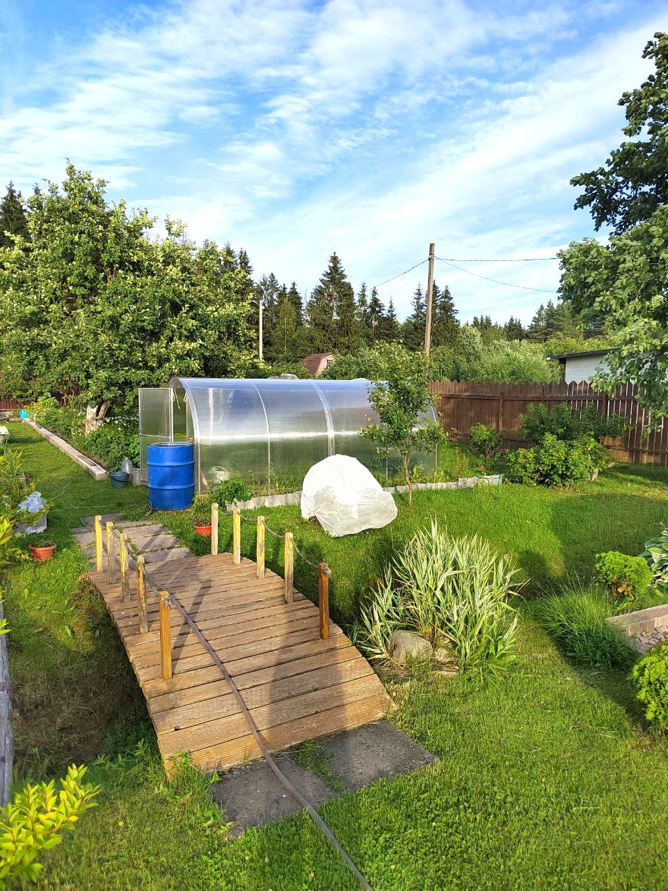 Добротный высокий забор по всему периметру участка.