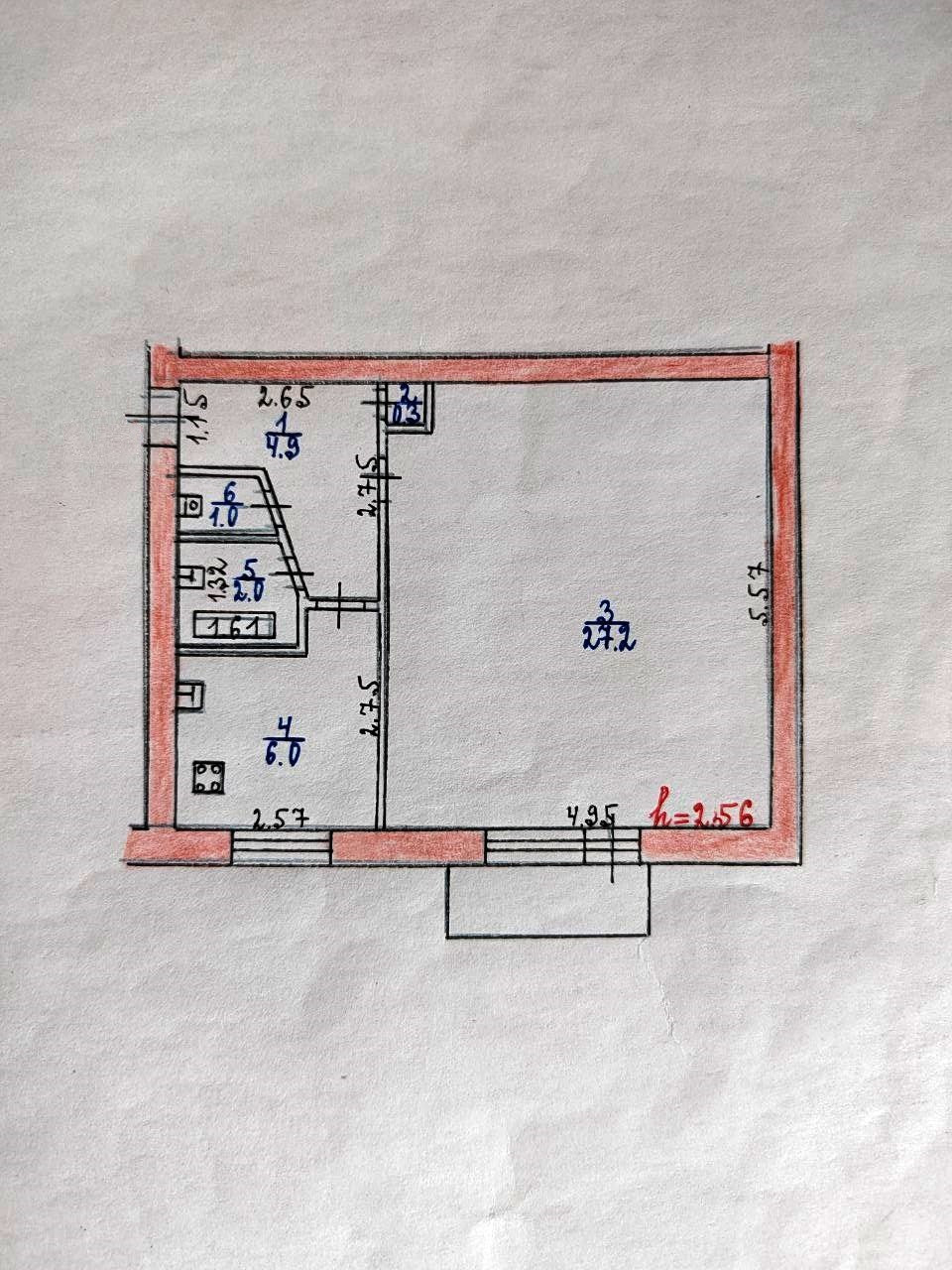 Общая площадь квартиры 41.4 м². Комната с выходом на балкон, правильной прямоугольной формы, очень просторная 27.2 м²; кухня компактная 6 м²; раздельный сан. узел.