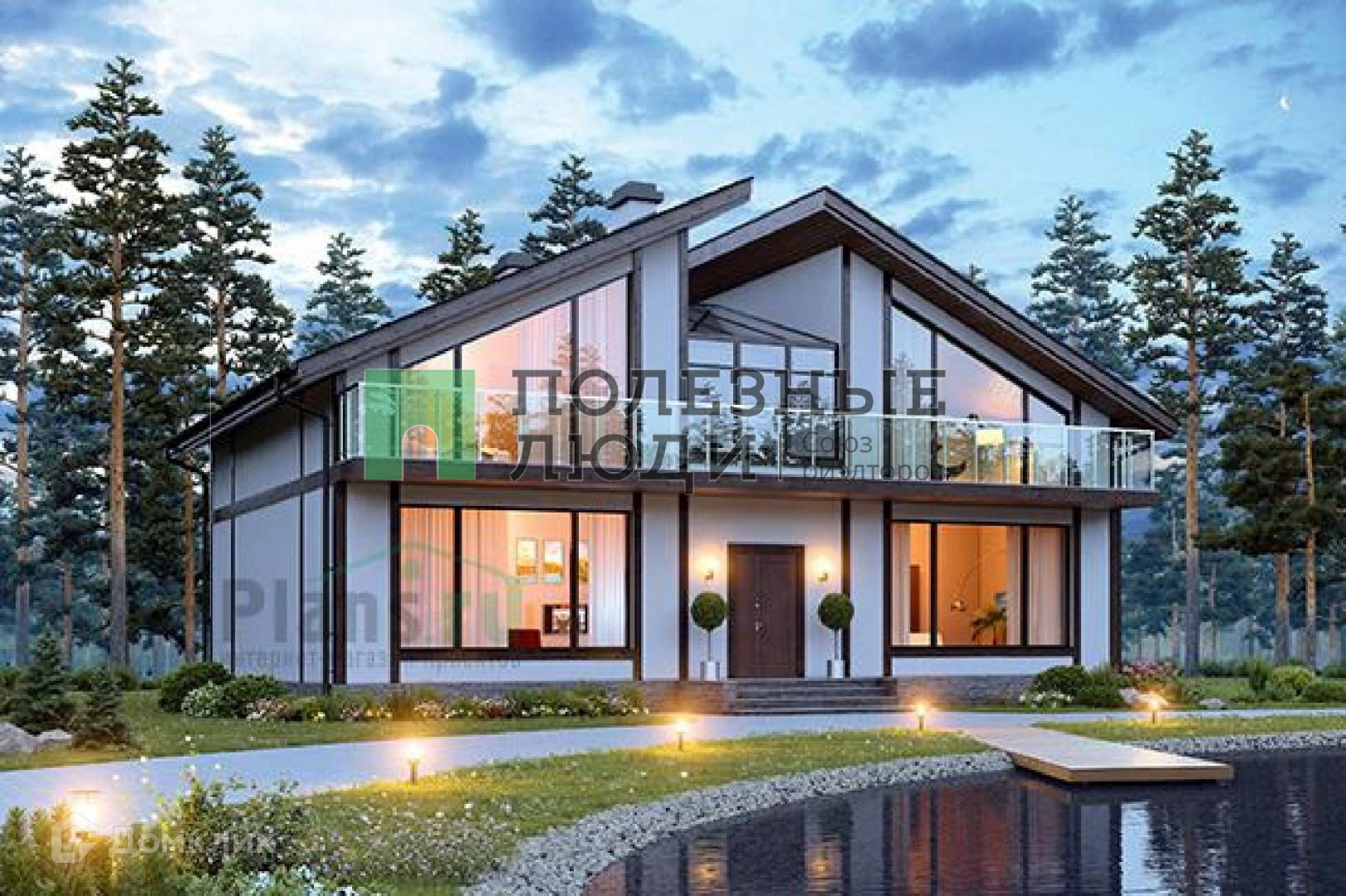 Дом 2-этажный площадью 226 кв. м. с панорамными окнами и с 6 комнатами.