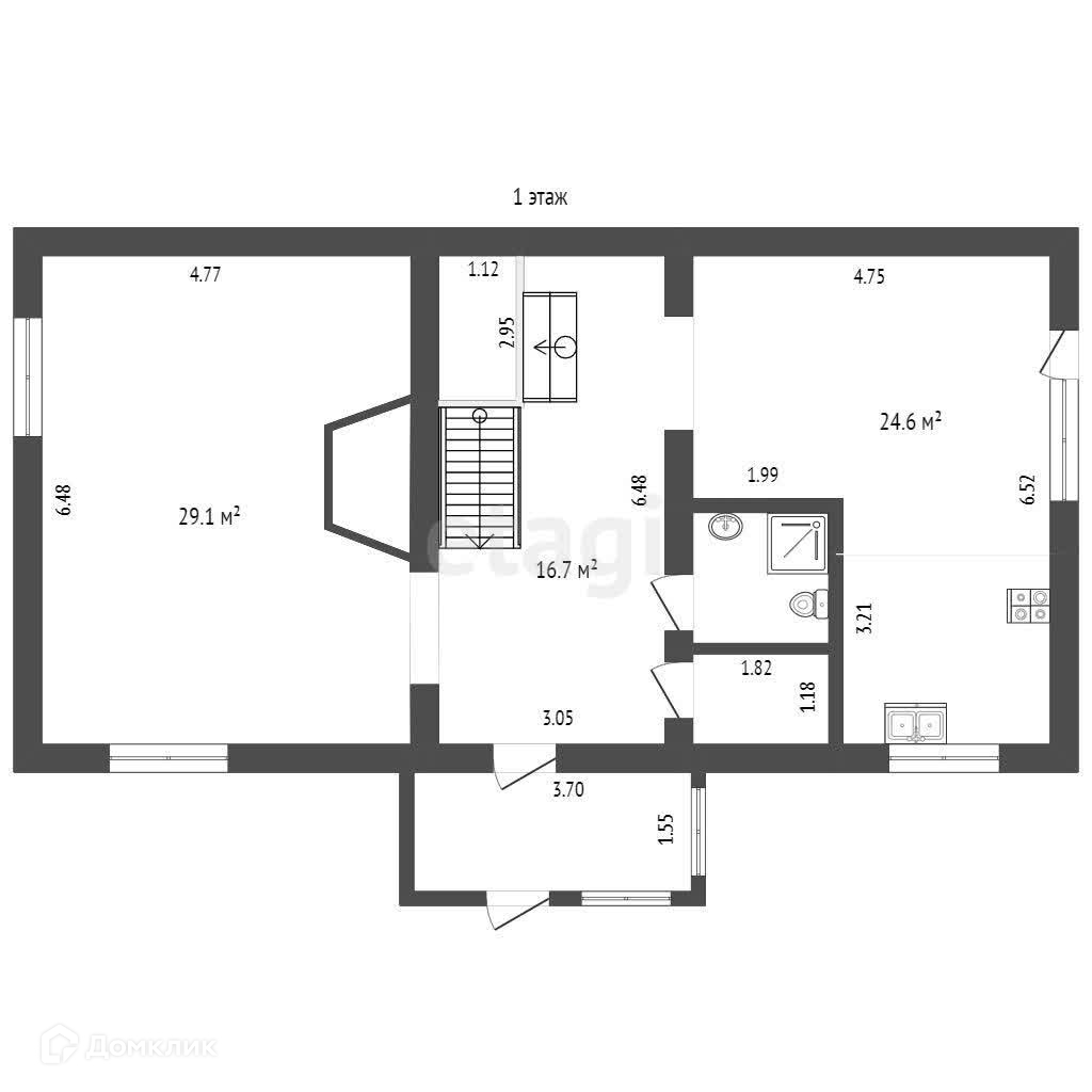 На первом этаже расположен каминный зал 29 кв.м. и кухня-гостиная 24,6 кв.м., а также котельная, санузел и лестница на второй этаж. Камин рабочий, можно использовать после окончания отопительного сезона. Из кухни предусмотрен дополнительный выход на участок.