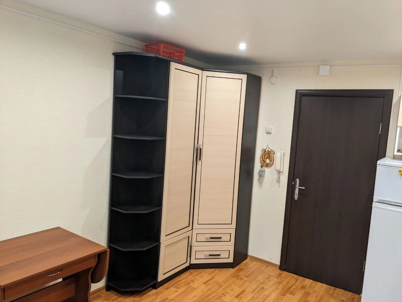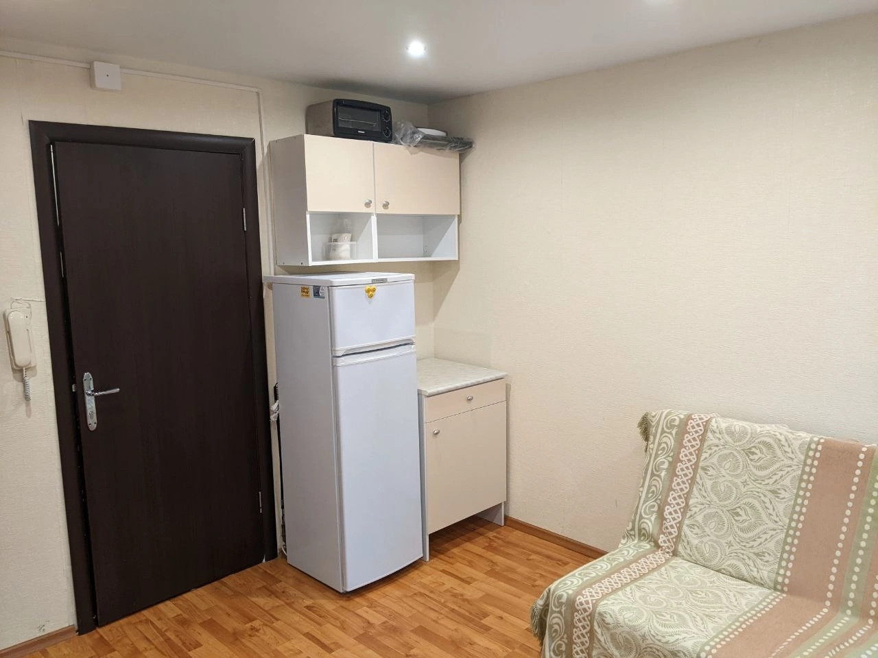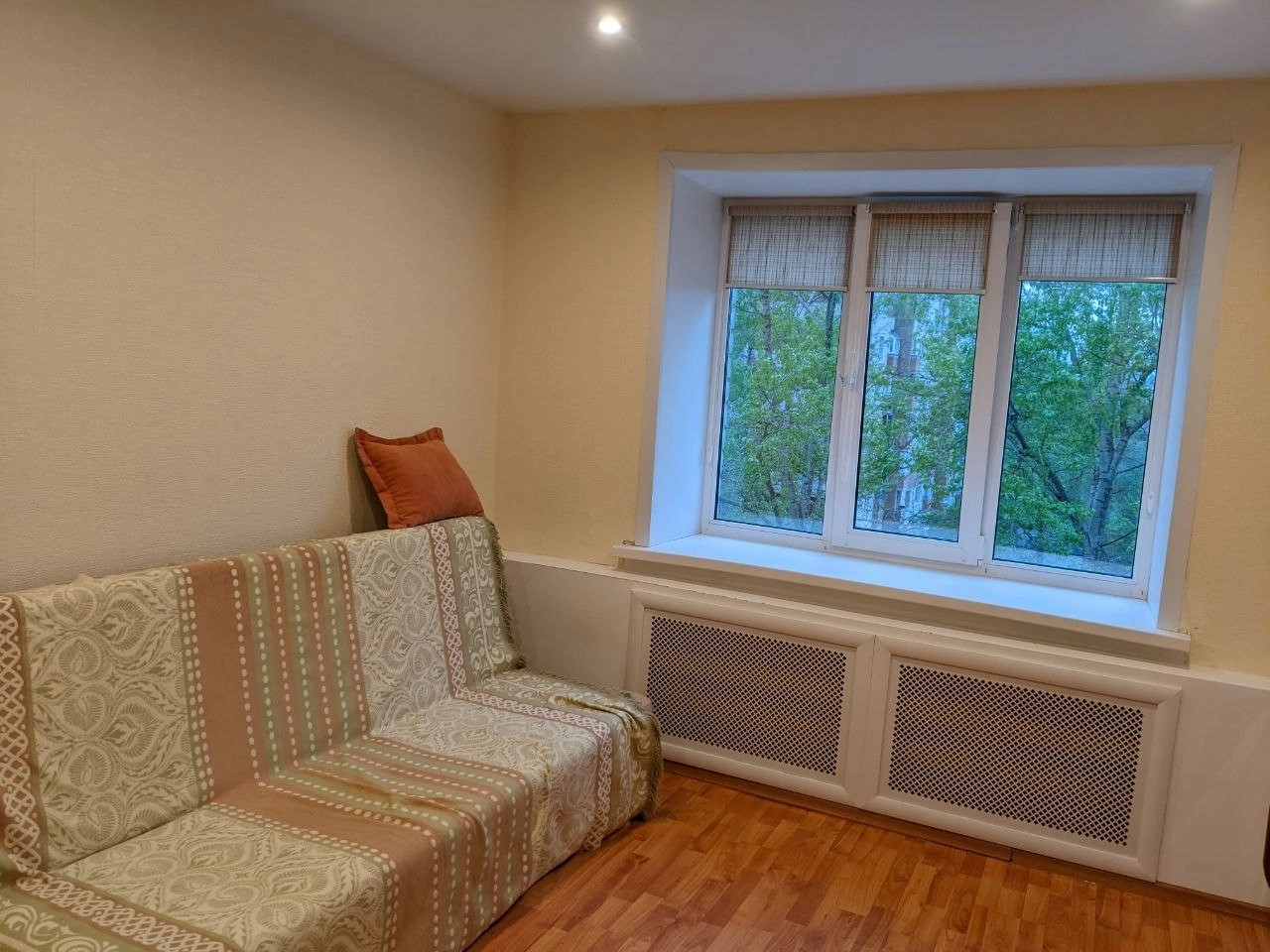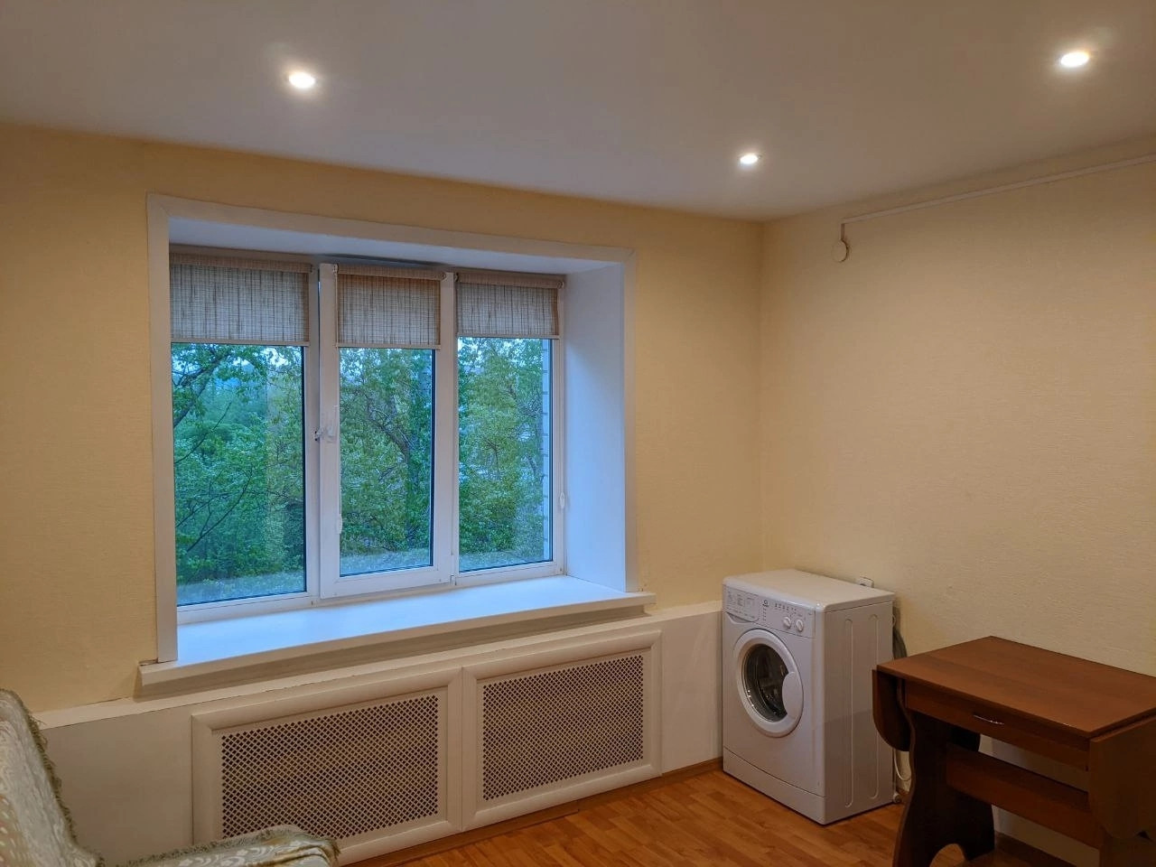 В комнате свежий ремонт: сделаны натяжные потолки с точечными светильниками, батареи закрыты, установлено пластиковое окно, на котором уже есть жалюзи, на полу – ламинат, проводка заменена. Также есть отдельный электросчетчик на комнату.