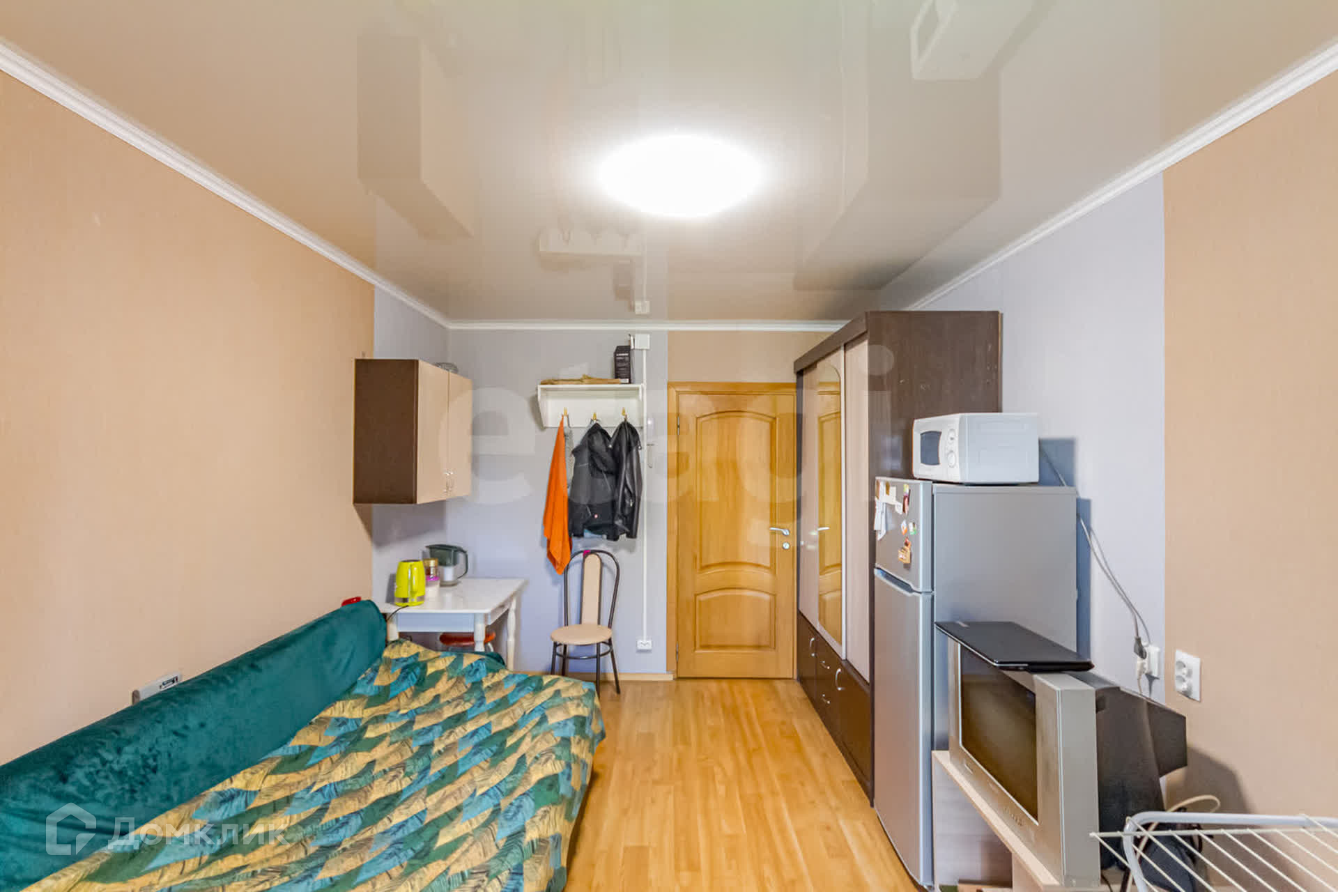В комнате выполнен свежий косметический ремонт: натяжной потолок, на полу линолеум. Есть балкон, обшит панелями, наливной пол.