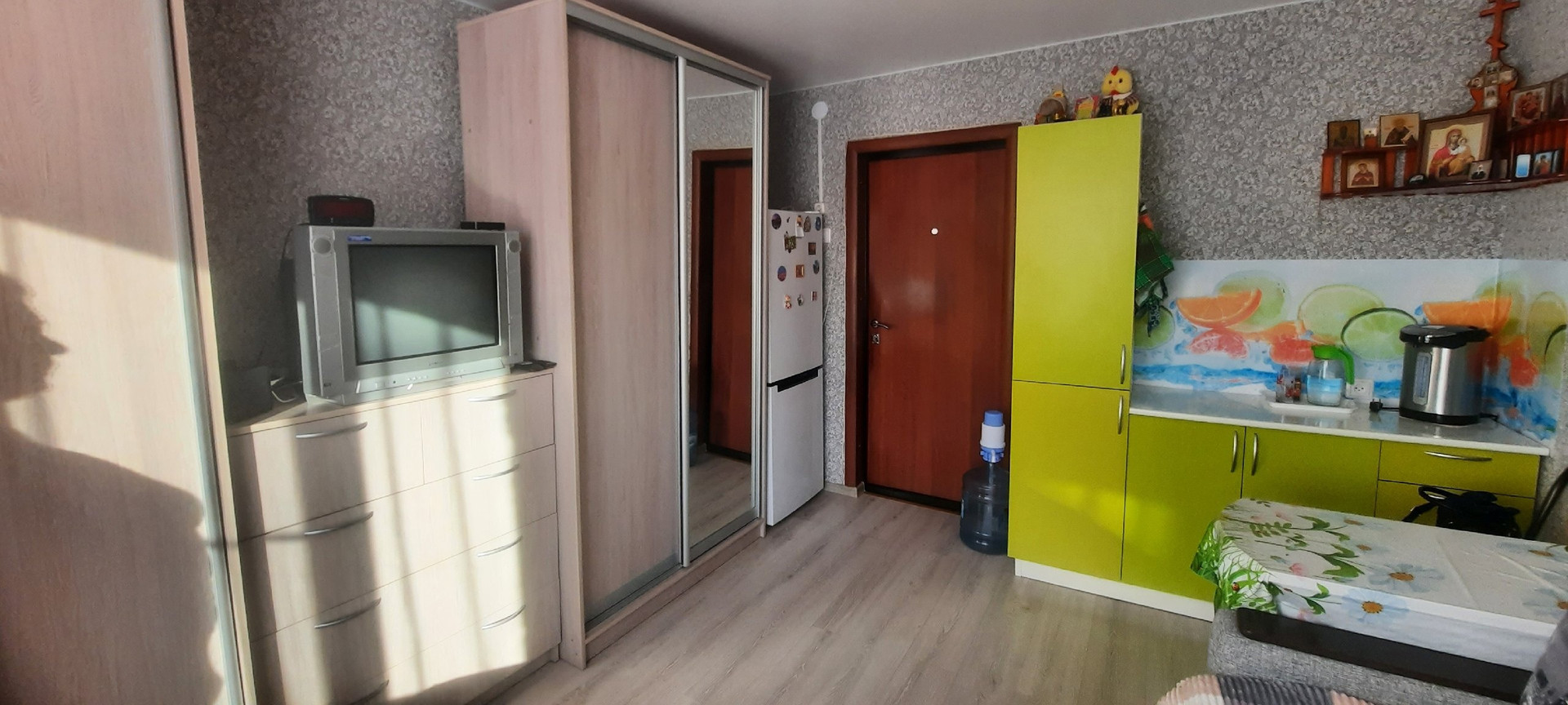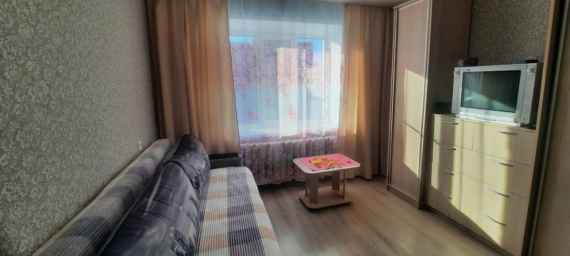 Комната светлая, теплая и очень уютная обязательно понравится новому собственнику. Потолок- натяжной с точечными светильниками, окно в комнате заменено, на полу- ламинат. Новому собственнику остается в подарок кухонный гарнитур.