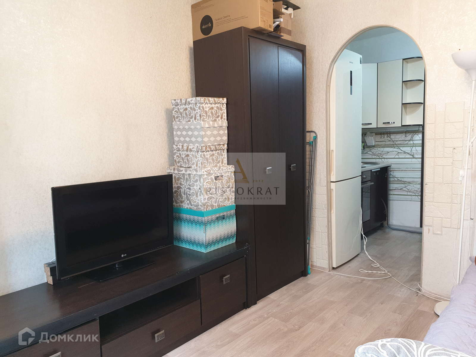 В комнате выделена зона кухни с кухонным гарнитуром, установлен встроенный, функциональный шкаф-купе.