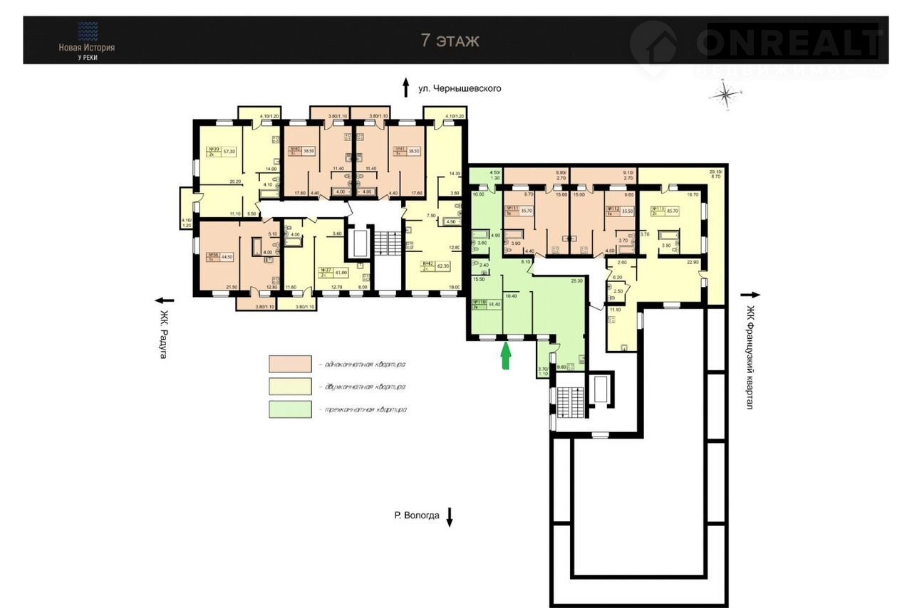3-комнатная квартира, 91.4 м2, этаж 7 / 7, на продажу в Вологде, набережная 6-й Армии