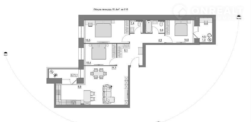 Общая площадь 91.4 м2