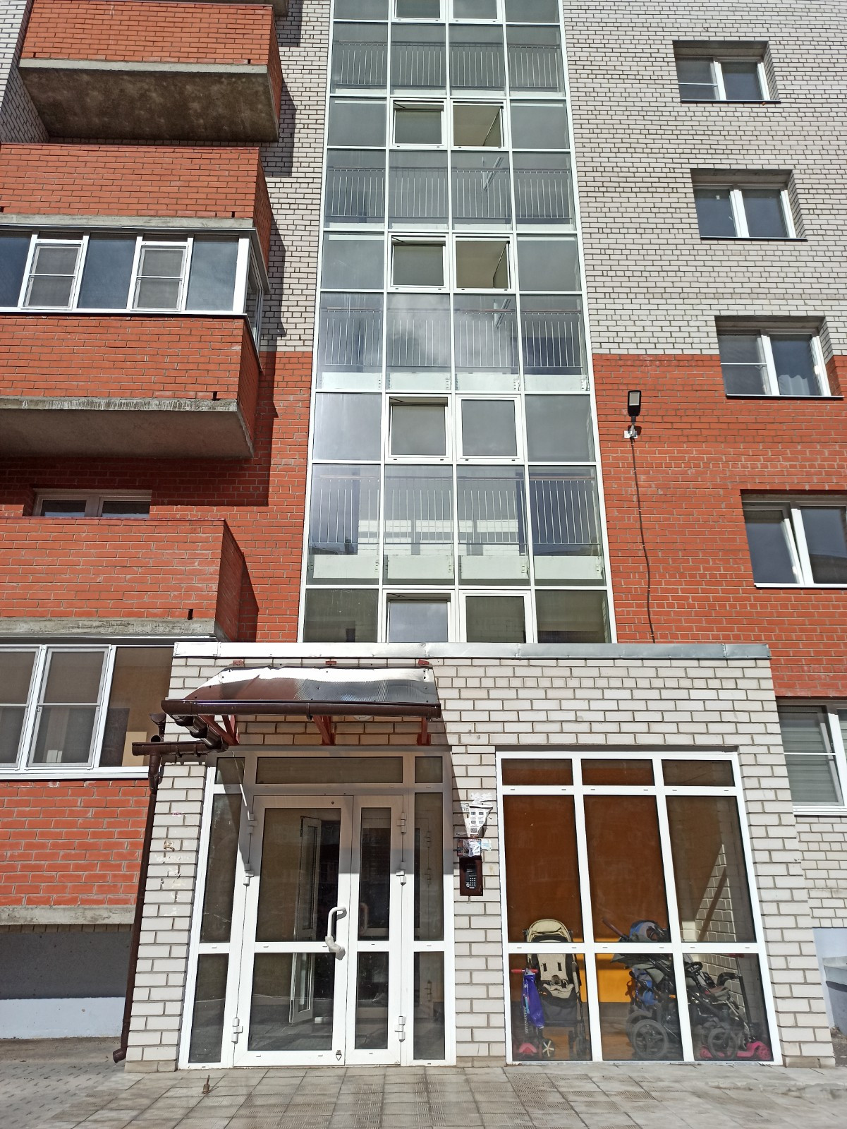 Дом полностью из кирпича. Витражное остекление и улучшенная отделка подъездов, уютно начиная от входа.