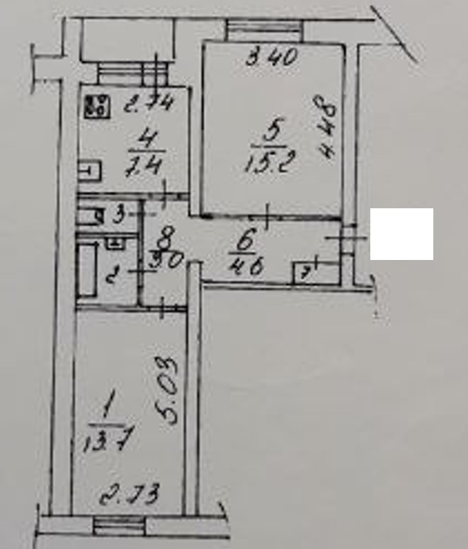 Жилая площадь – 28,9 кв.м, комната 1 -13,7 кв.м, комната 2 -15,2 кв.м, кухня – 7,4 кв.м, ванная – 2,6 кв.м, туалет – 1,2 кв.м коридор 1- 4,6 кв.м, коридор 2 – 3 кв.м, шкаф – 0,4 кв.м, лоджия – 1,3 кв.м. Лоджия застеклена.