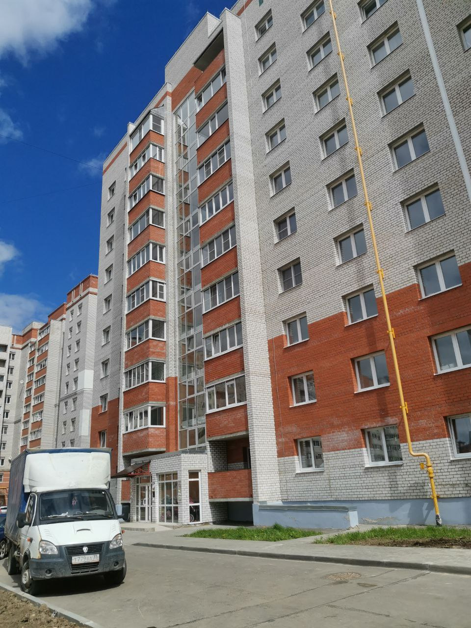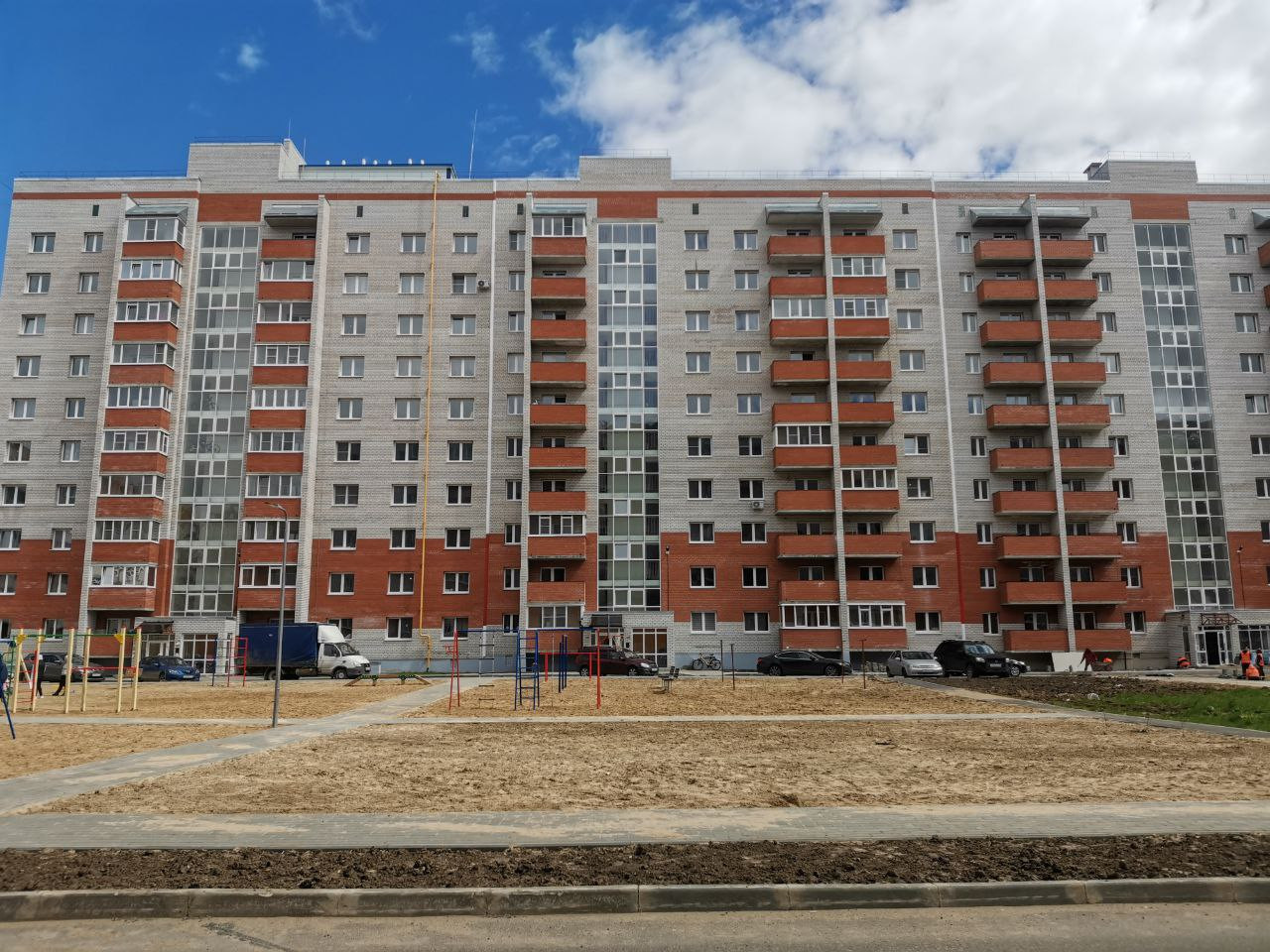 Витражное остекленение подъездов. Колясочные. Детская площадка и по плану благоустройство спортивной площадки. Большая парковка. Въезд через шлагбаум.