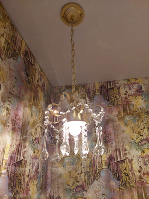 Обои шелкография, роскошные двери, лепнина, пол выложен кафелем.