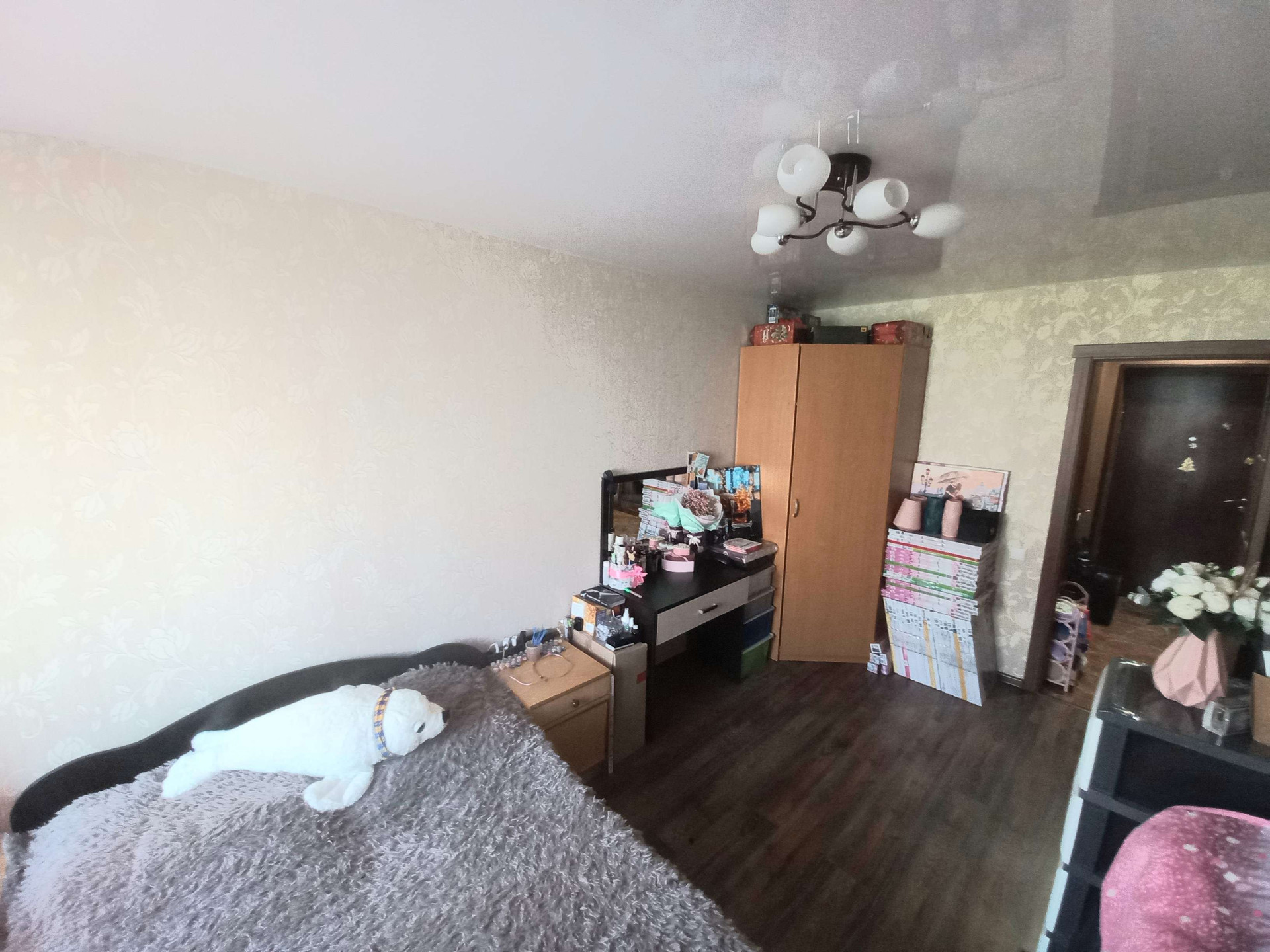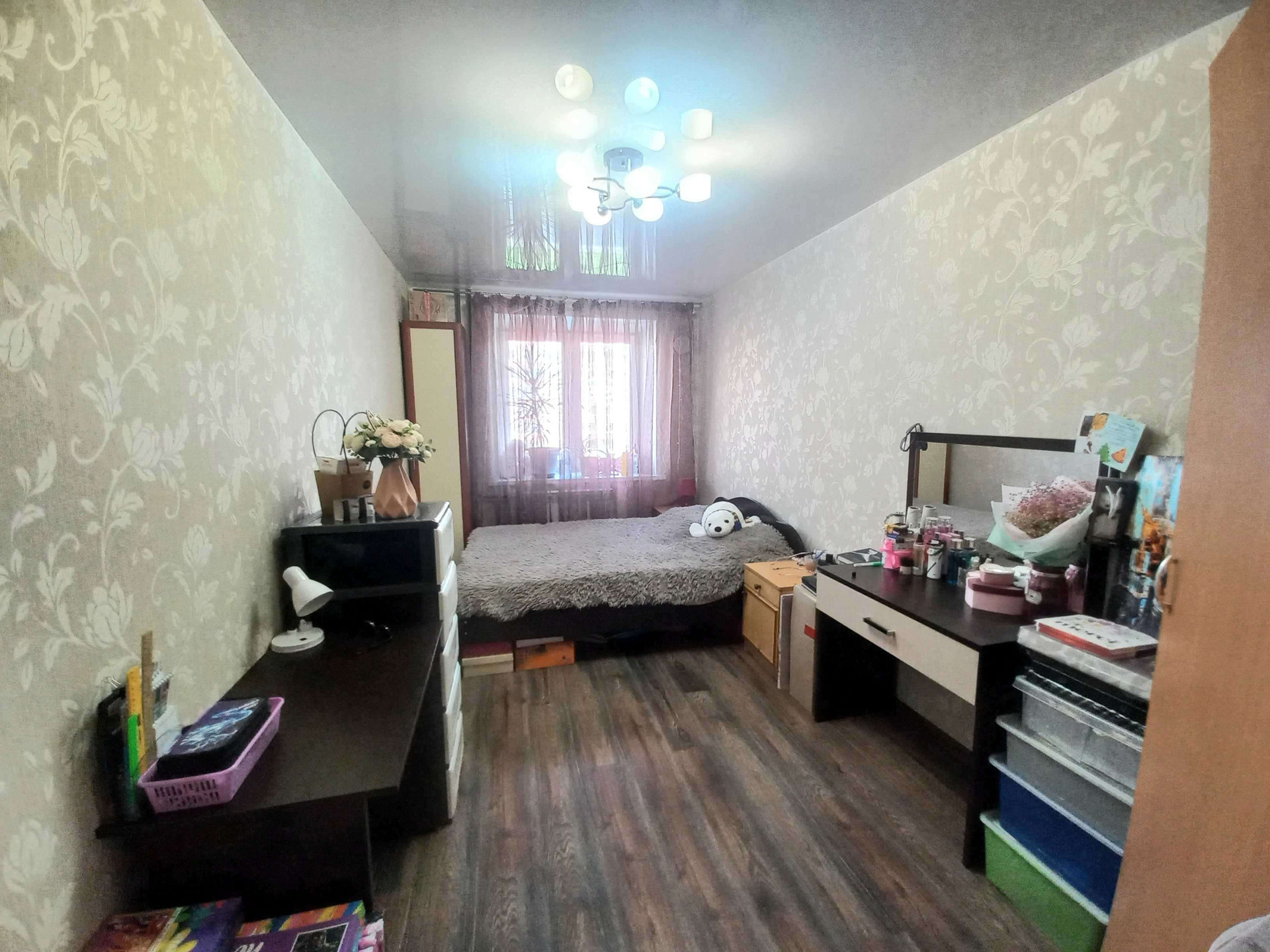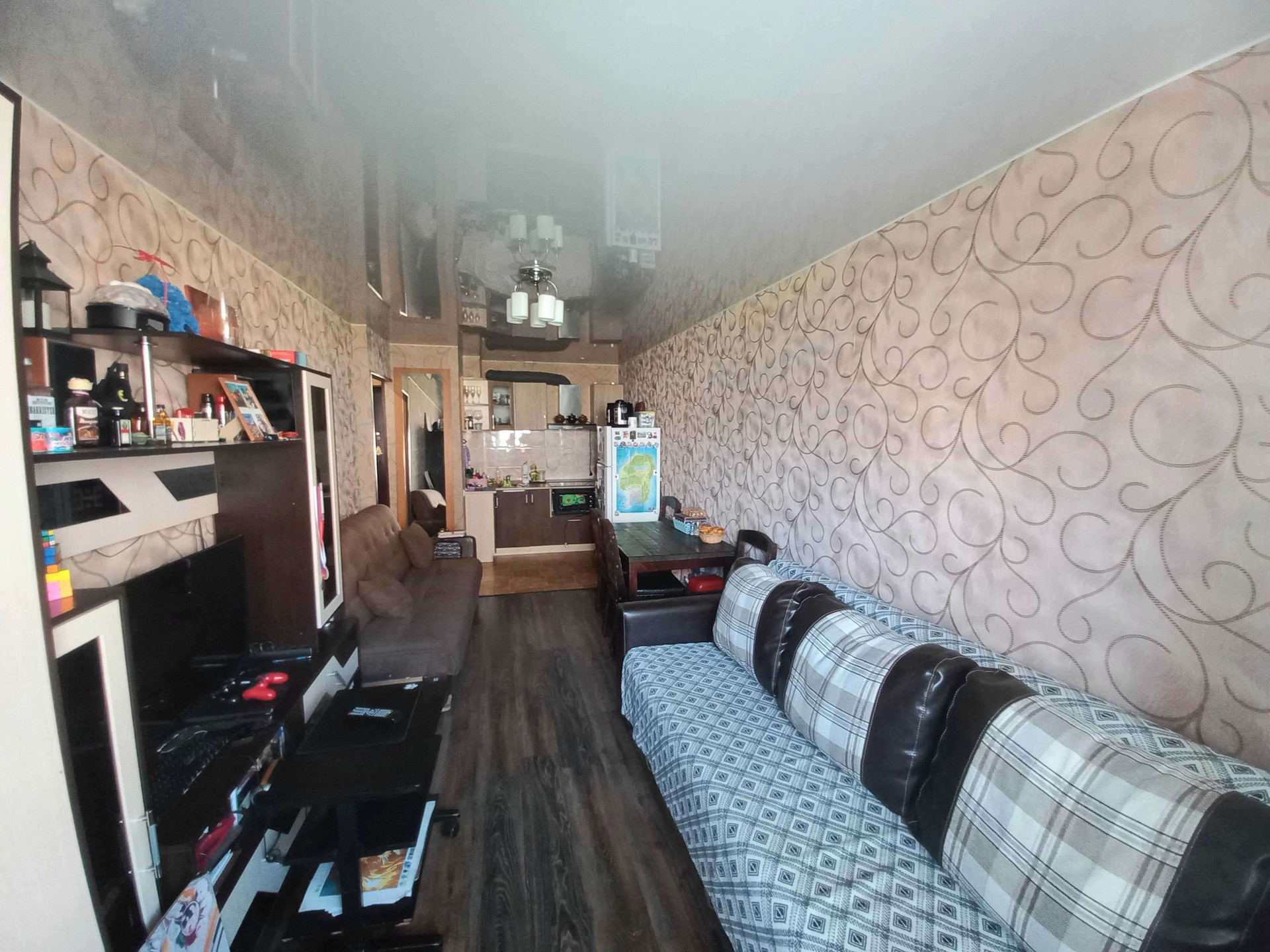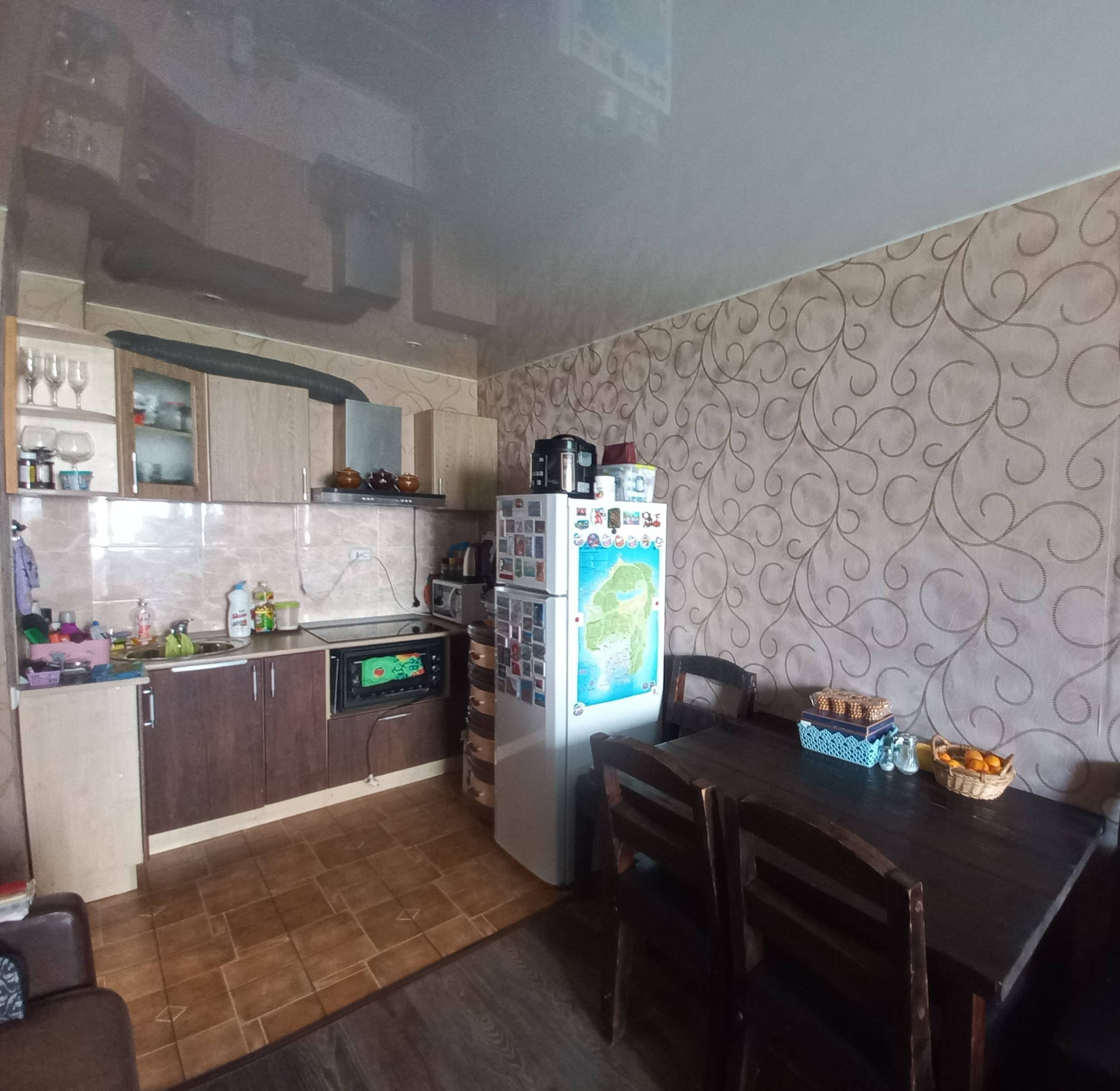 ванная  комната , коридор и часть кухни керамогранит, в комнатах ламинат,натяжные потолки. Мебель  и часть техники остаются.