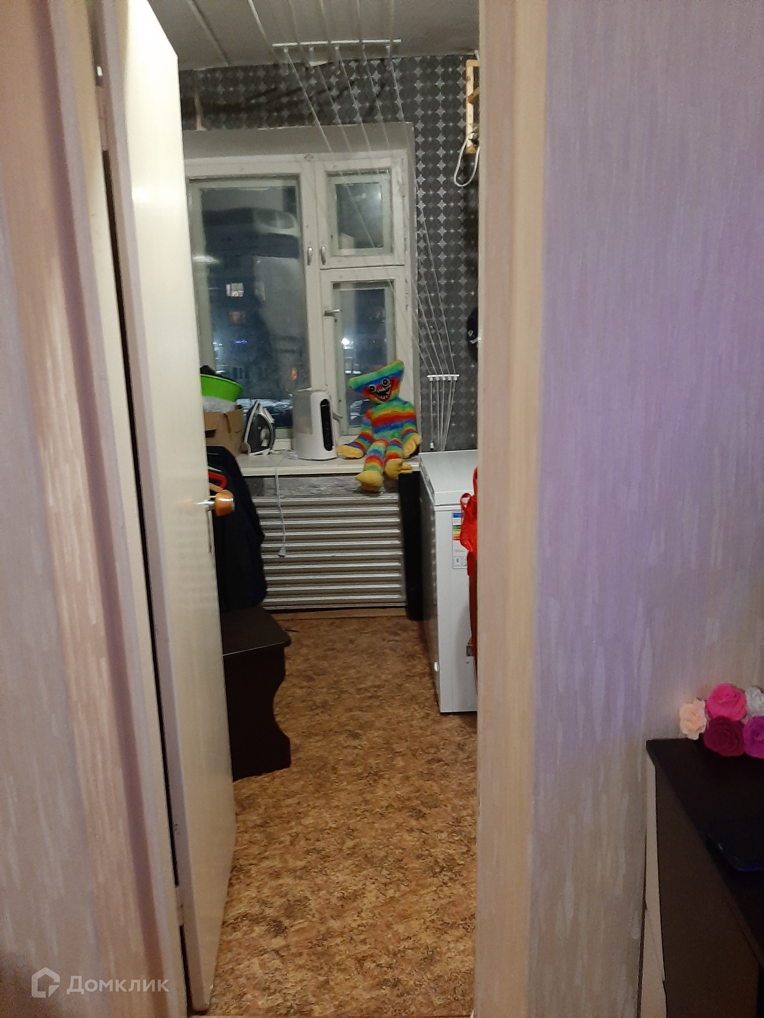 На полу линолеум, застекленная лоджия.