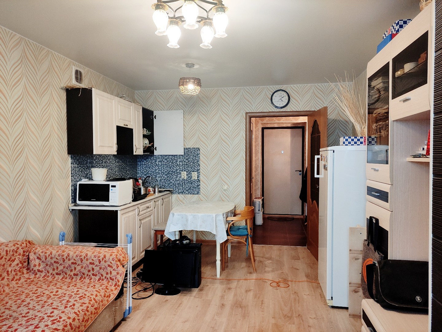 Квартира-студия в нормальном состоянии - обои, ламинат, натяжной потолок, окно стеклопакет, в санузле кафельная плитка (на светлой плитке темная затирка в швах, можно сделать светлые швы). Сохранились остатки обоев, ламината, если потребуется для коррекции.Теплая. Можно заехать и жить. Солнечная сторона света. Кроме указанной площади есть большой балкон 4,3 кв.м., (основание кирпич, остеклен стеклопакетами). В подъезде два лифта, в т.ч. грузопассажирский. Вид из окна на деревню и новый Рождественский парк, нет пыли, свежий воздух. Дом находится в новом, активно строящемся районе, за ТЦ "Шоколад". Рядом ТЦ "Макси". Вся инфраструктура есть в пешей доступности, рядом остановка общественного транспорта, близко ДК ПЗ. квартира без долгов и обременений. Любой вид расчета. По альтернативной покупке пока планируется новострой.