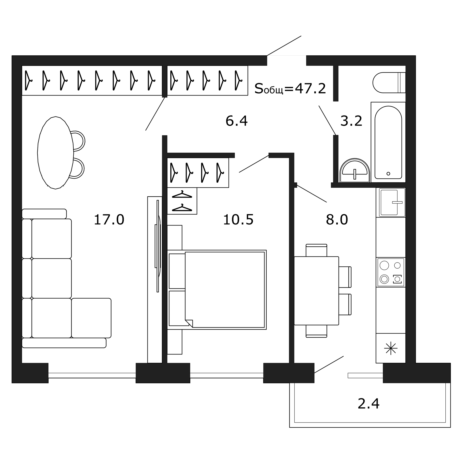 Общая площадь 45.6 м2