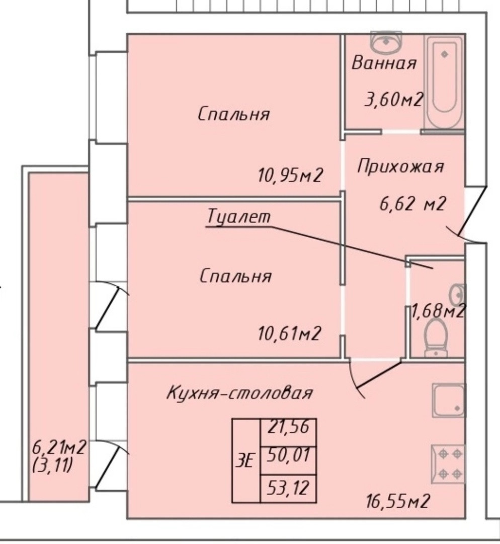 Общая площадь 53.12 м2
