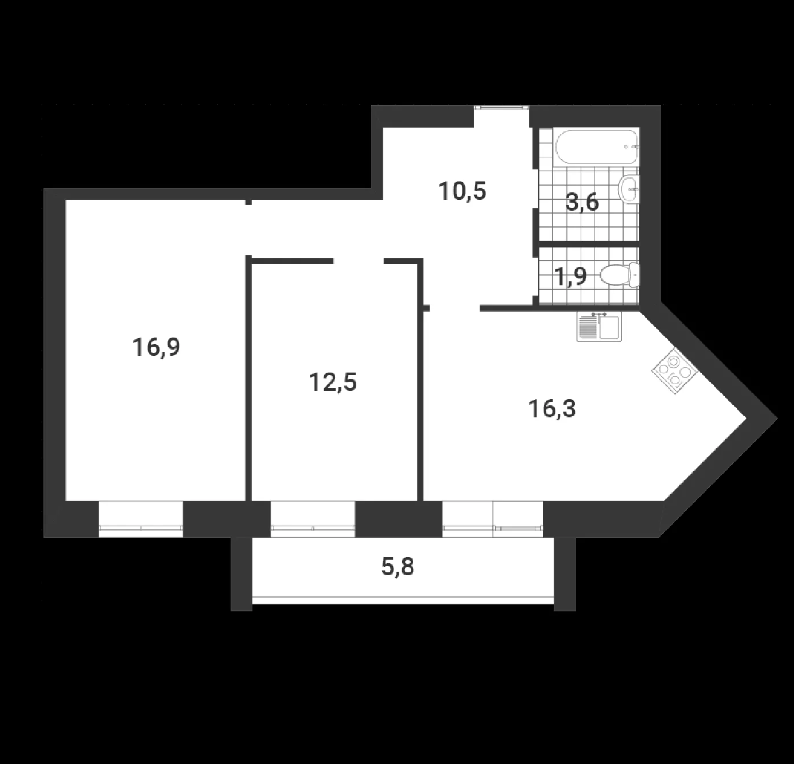 Кухня-гостиная 16,3 м2 и две спальни 16,9 м2, 12,5 м2.