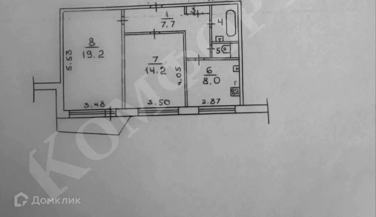Квартира не угловая, удобная планировка - комнаты изолированные 14,2 кв.м и 19,2 кв.м, кухня 8 кв.м., санузел раздельный, межкомнатные двери поменяны, балкон застеклен пластиком.