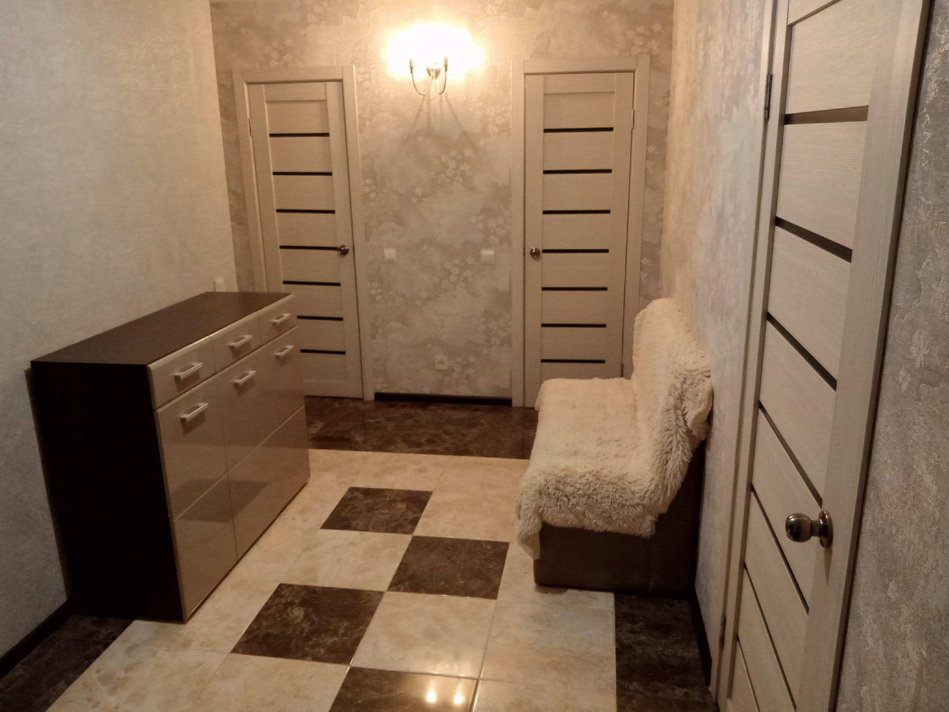 туалете выложены плиткой в один уровень, без порогов. Выровнены стены, дорогие обои, хорошие межкомнатные двери.