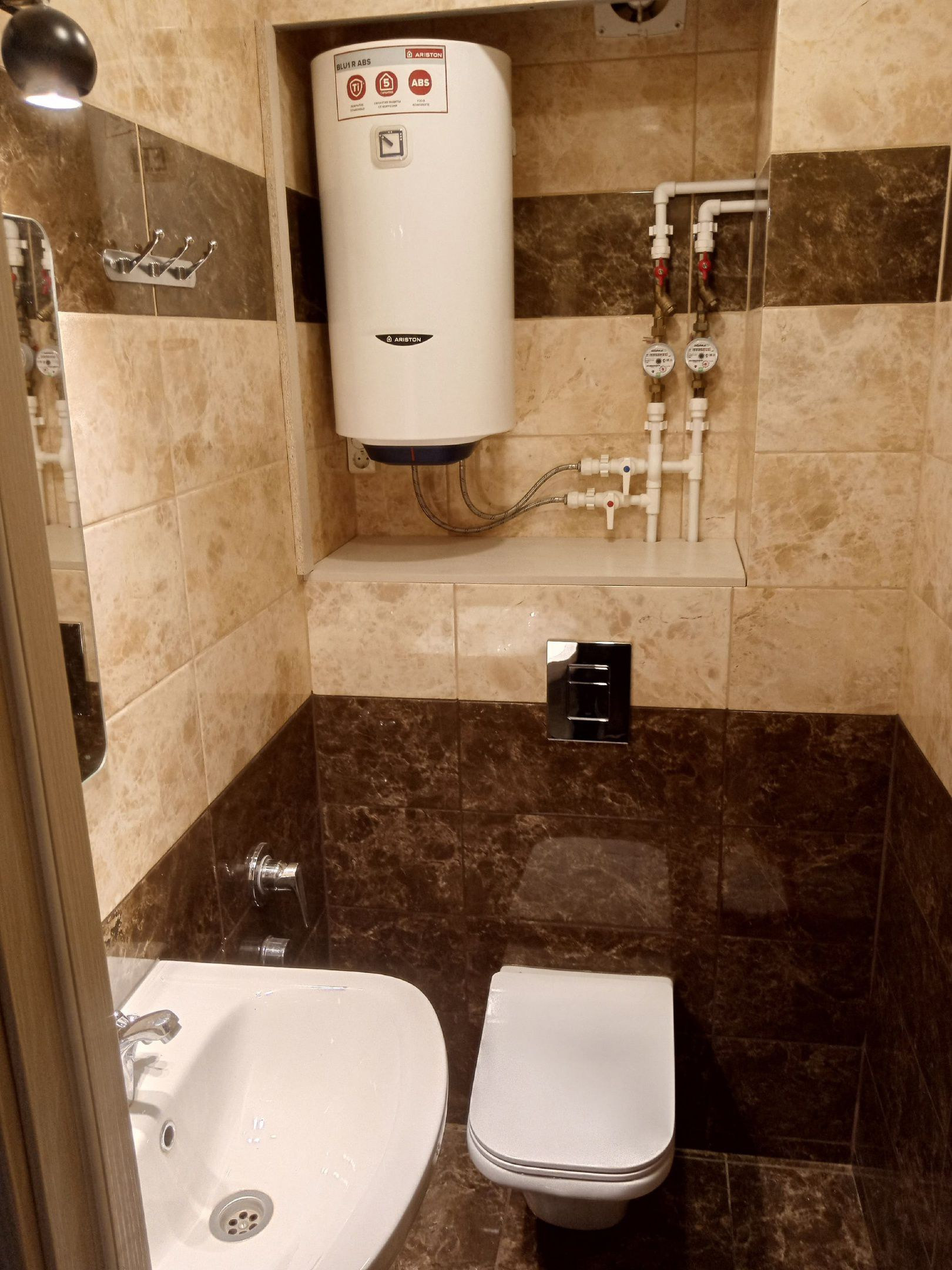 Качественная, дорогая сантехника, встроенный в стену смеситель в ванной с тропическим душем, встроенный гигиенический душ в туалете, выводы под водонагреватель. Немецкая инсталляция Grohe.
