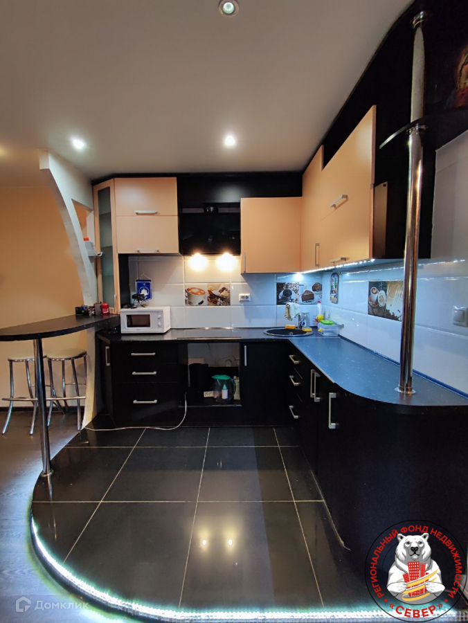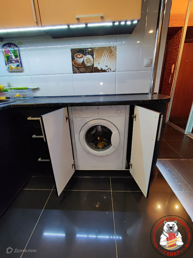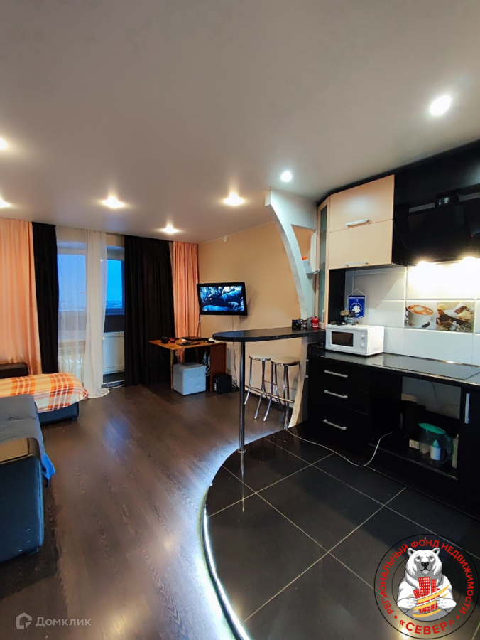 В комнате: зона кухни отделена барной стойкой и подиумом. Кухонный гарнитур с варочной панелью и встроенной стиральной машиной остается новым собственникам. Сделана подсветка подиума. Остается также спальное место -диван. Потолки натяжные, на полу - ламинат. Лоджия застеклена и утеплена. В санузле отделка коллекционной керамической плиткой. Остается вся сантехника. В прихожей встроенный гардеробный шкаф.