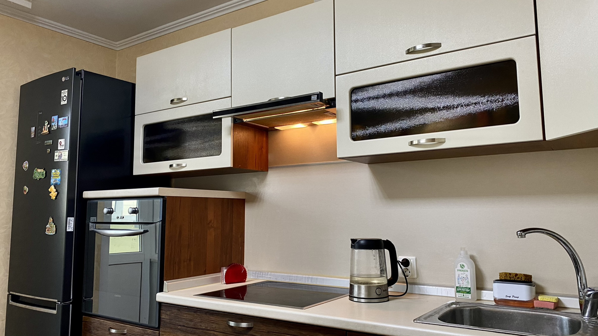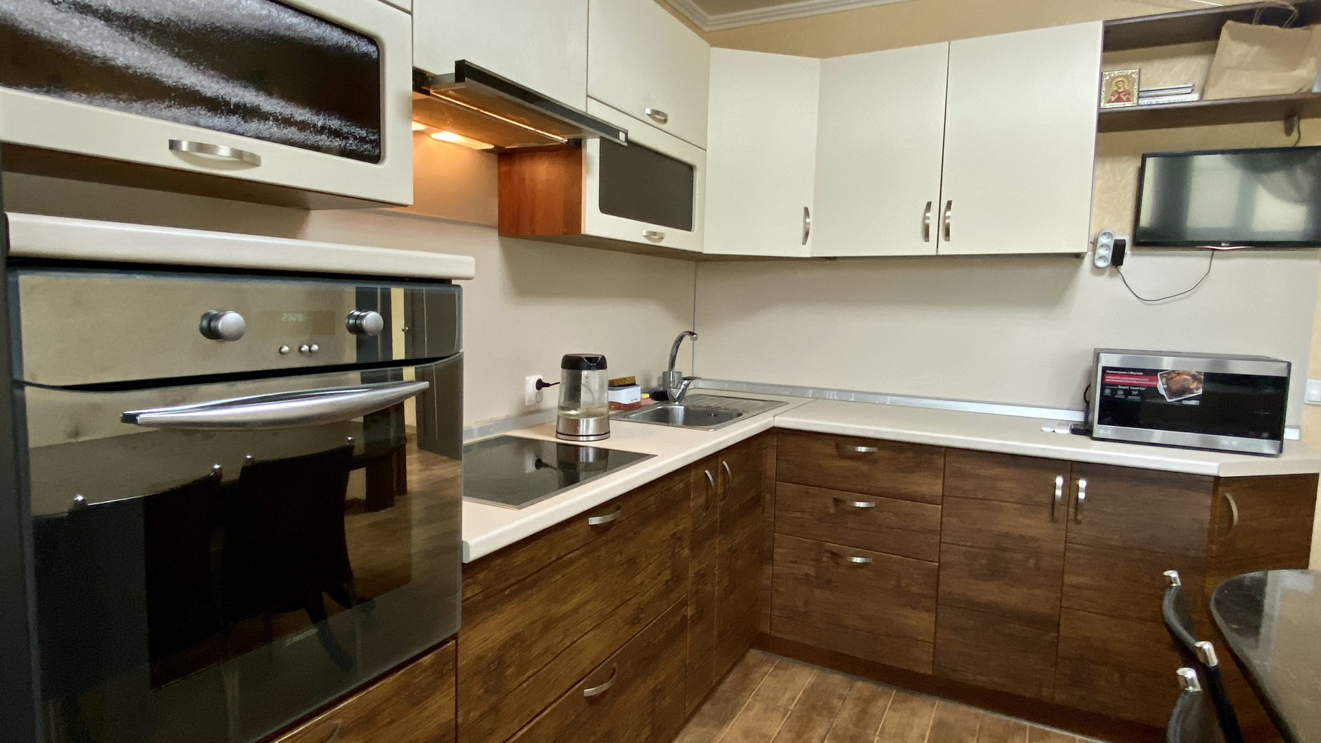 Кухня: 11.5м.кв. Угловой диван со спальным местом, крепкий деревянный стол, гарнитур, холодильник, духовой шкаф, стиральная машина, всё вам!