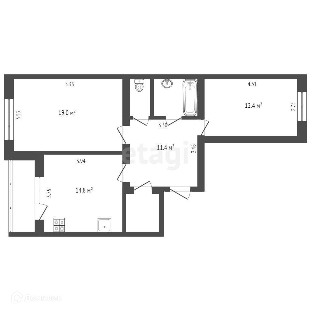 Удобная планировка, окна на 2 стороны, изолированные комнаты (19 м2 и 12,4 м2), просторная кухня-гостиная площадью 14,8 м2.