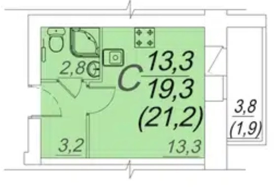 Комната 13,3 м2 ,(с выходом на застекленную лоджию-3,8 м2), коридор-3,2 м2, санузел совмещен -2,8 м2.