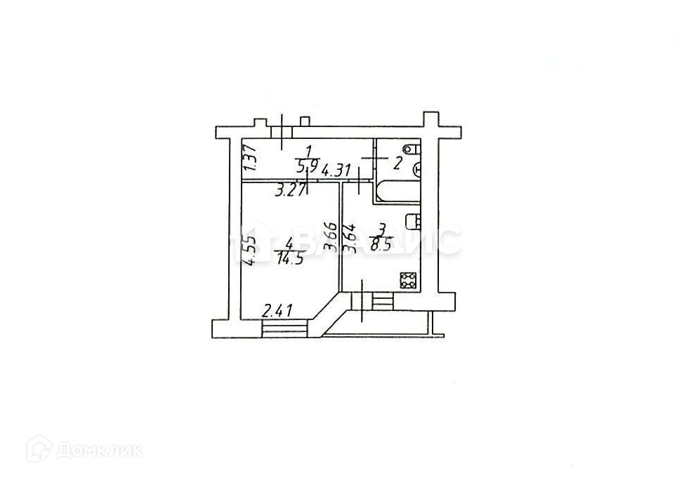 Общая площадь 33.4 м2