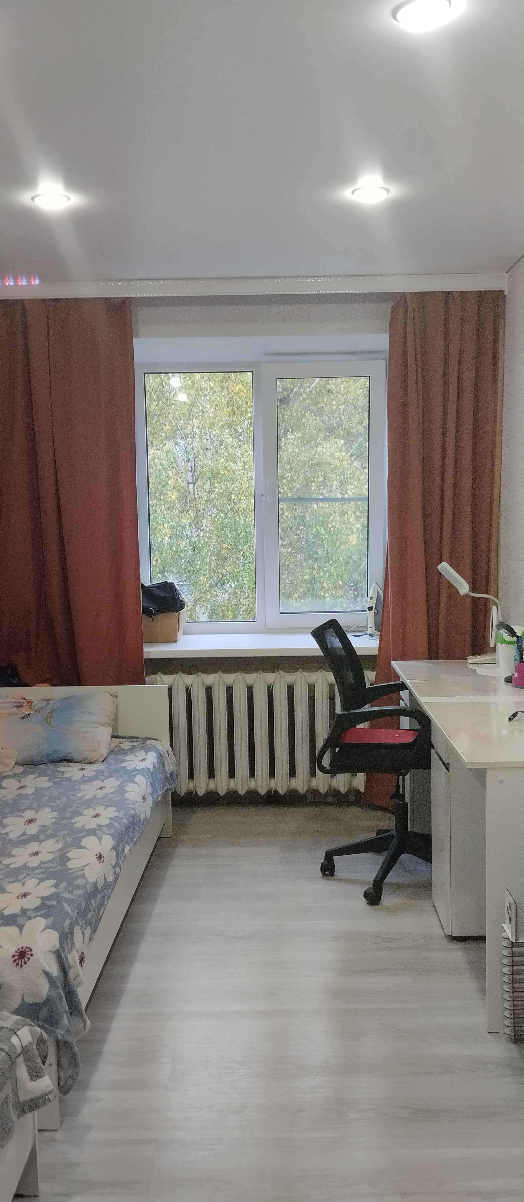 комнаты на разные стороны(распашонка).окна пластиковые,потолки натяжные по всей квартире.пол ламинат.ванна с туалетом совмещённые с ремонтом.входную дверь недавно поменяли.встроенный шкаф в одной из комнат.балкон застеклен (не пластик).остаеться кухонный гарнитур,стол,плита газовая новая,комод.в подарок остаеться кондиционер.тихие спокойные соседи.