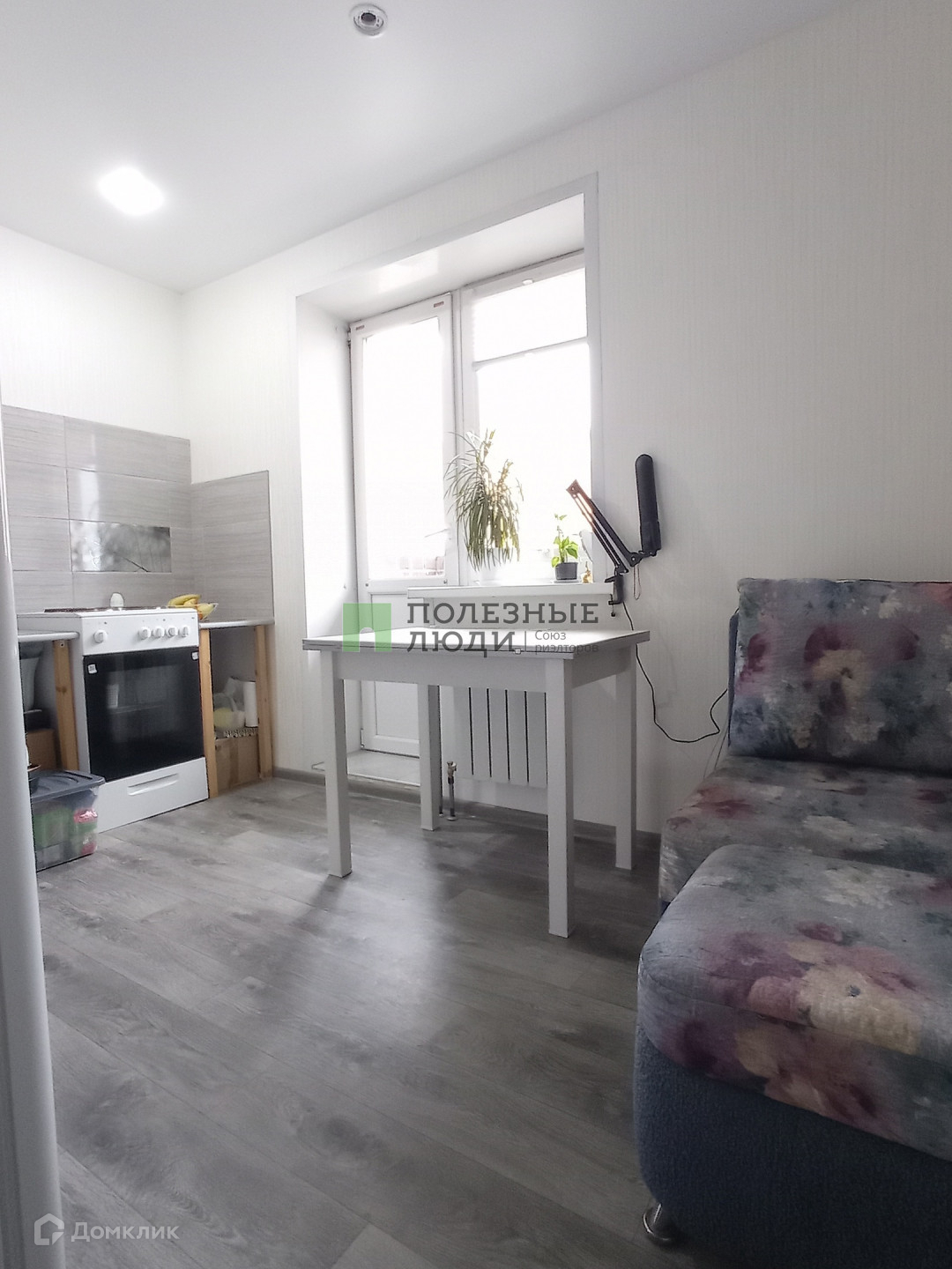 Потолки натяжные, ламинат в комнате, линолеум на кухне.