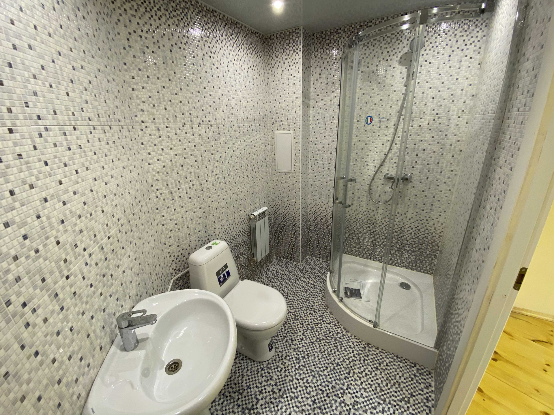 В санузле стиральная машина, душевая кабинка