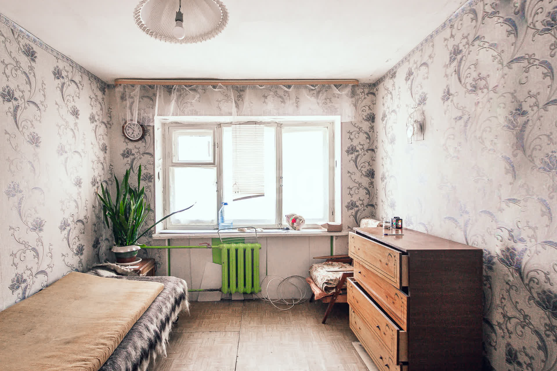 В комнате имеется стол, комод, кровать, сервант.