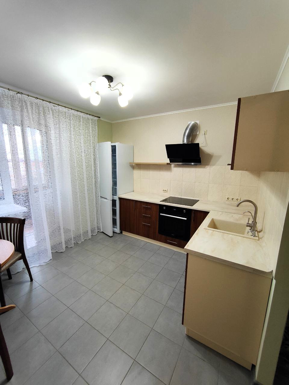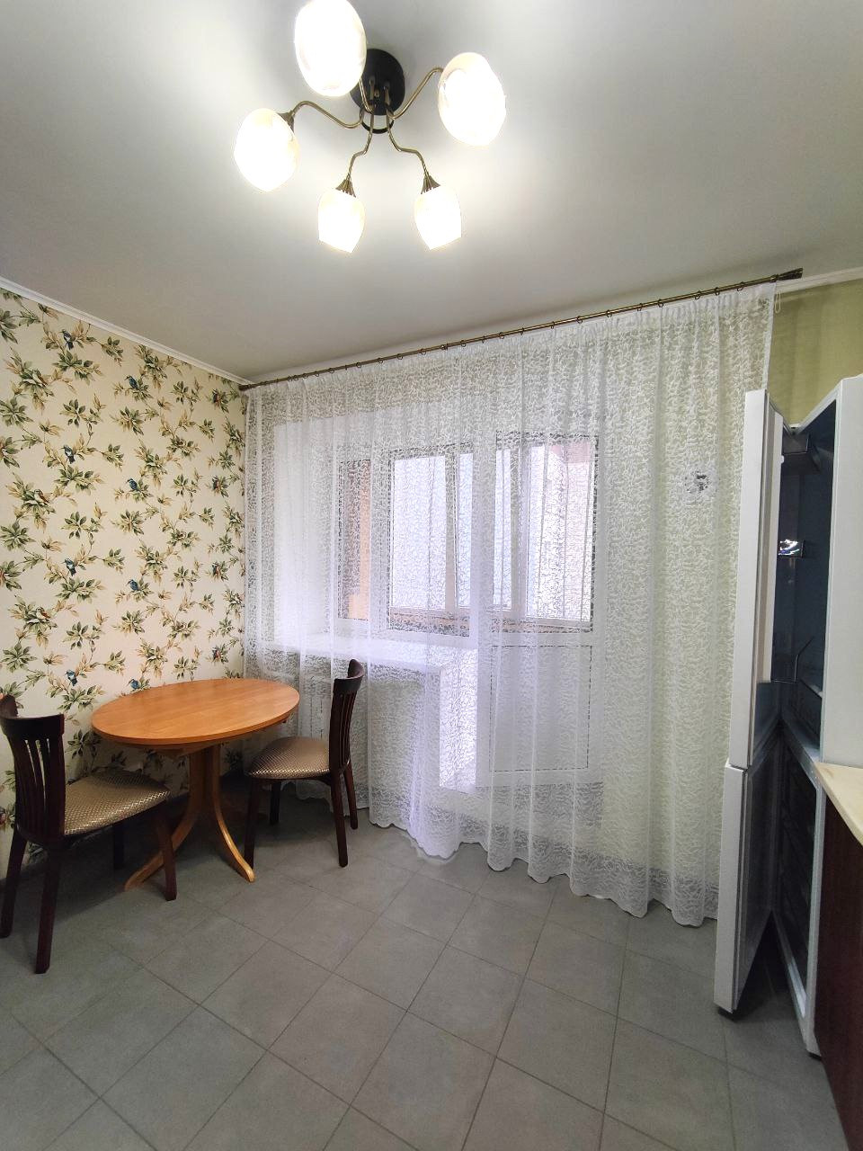 Современная планировка с большой кухней и выходом на застеклённую лоджию.