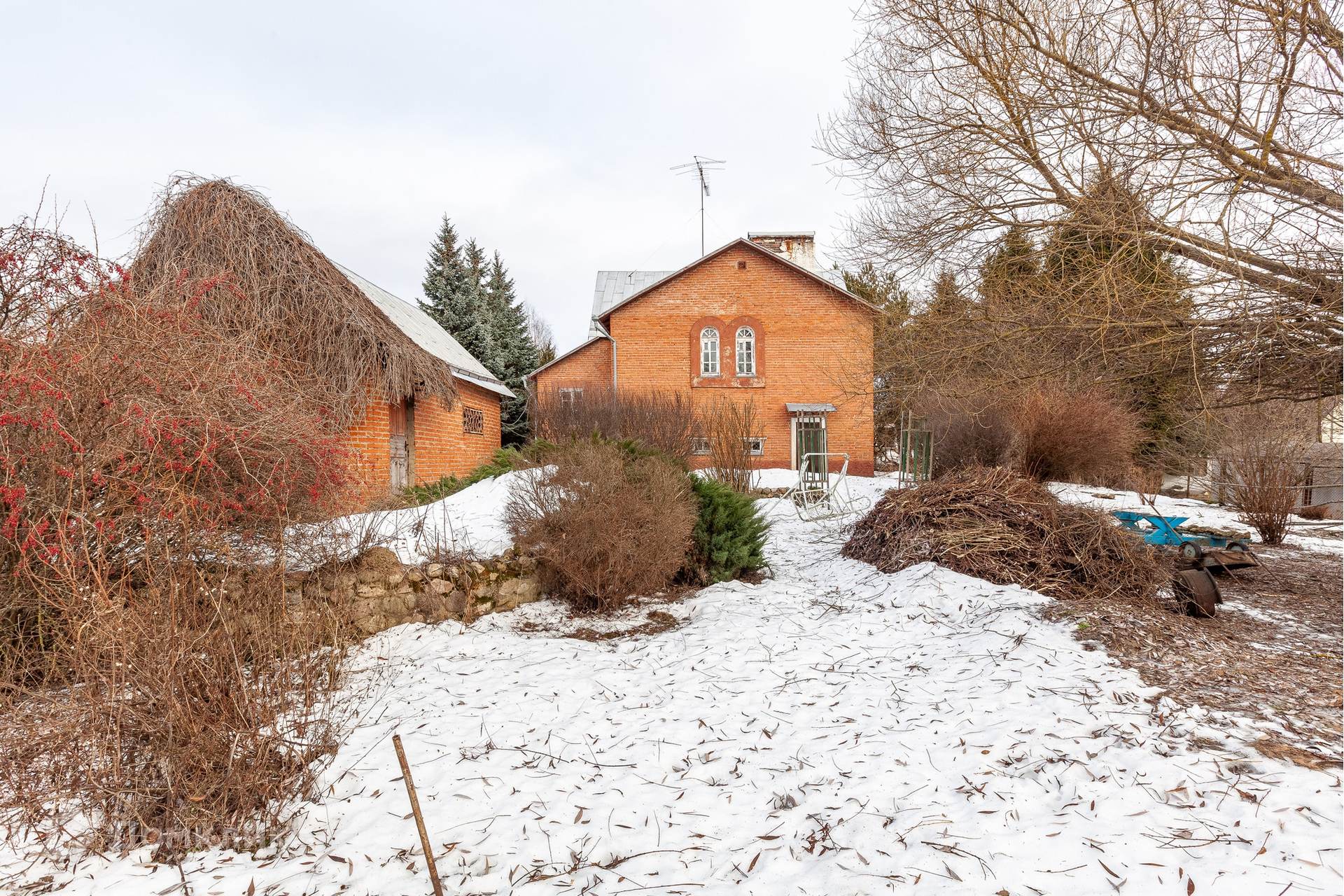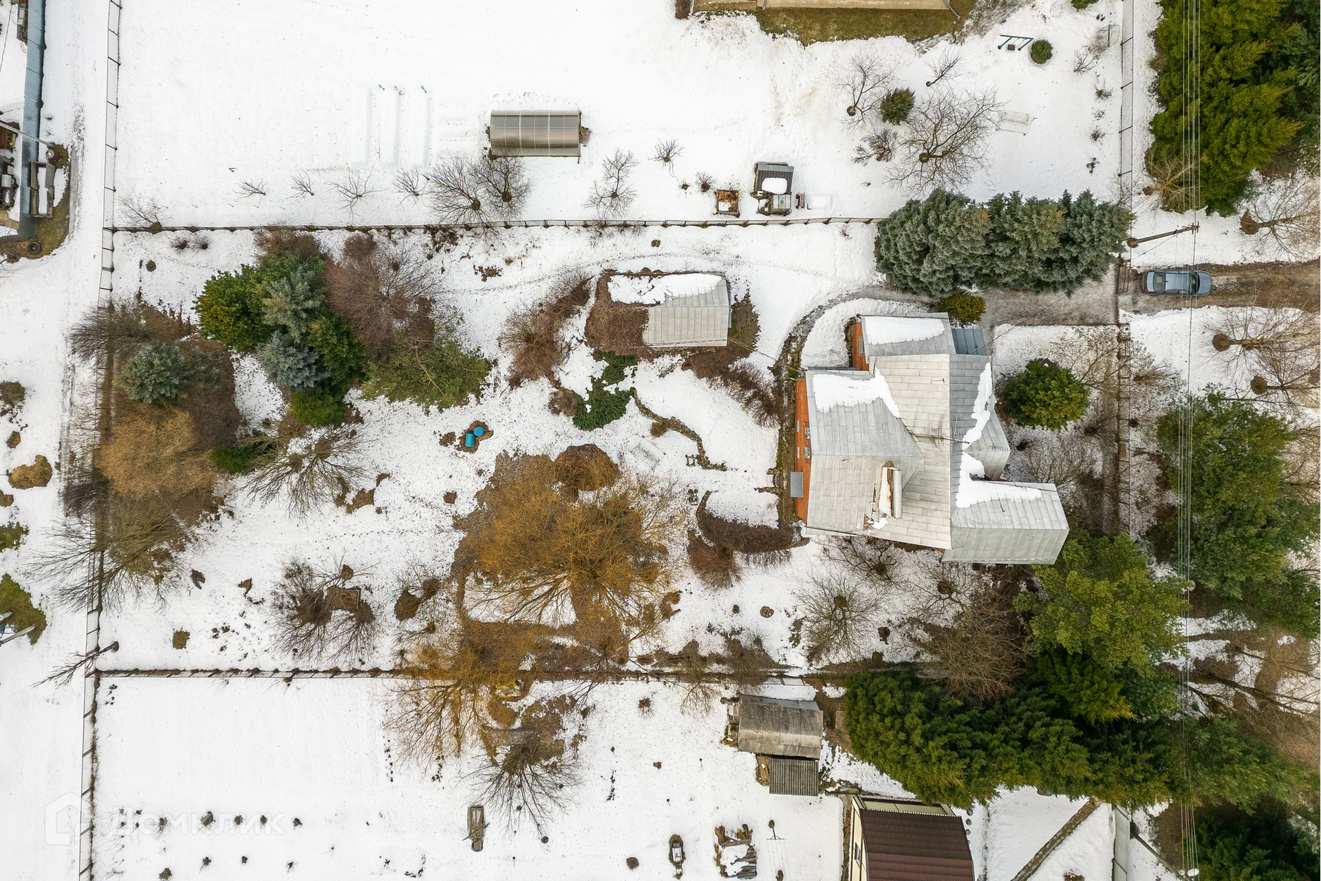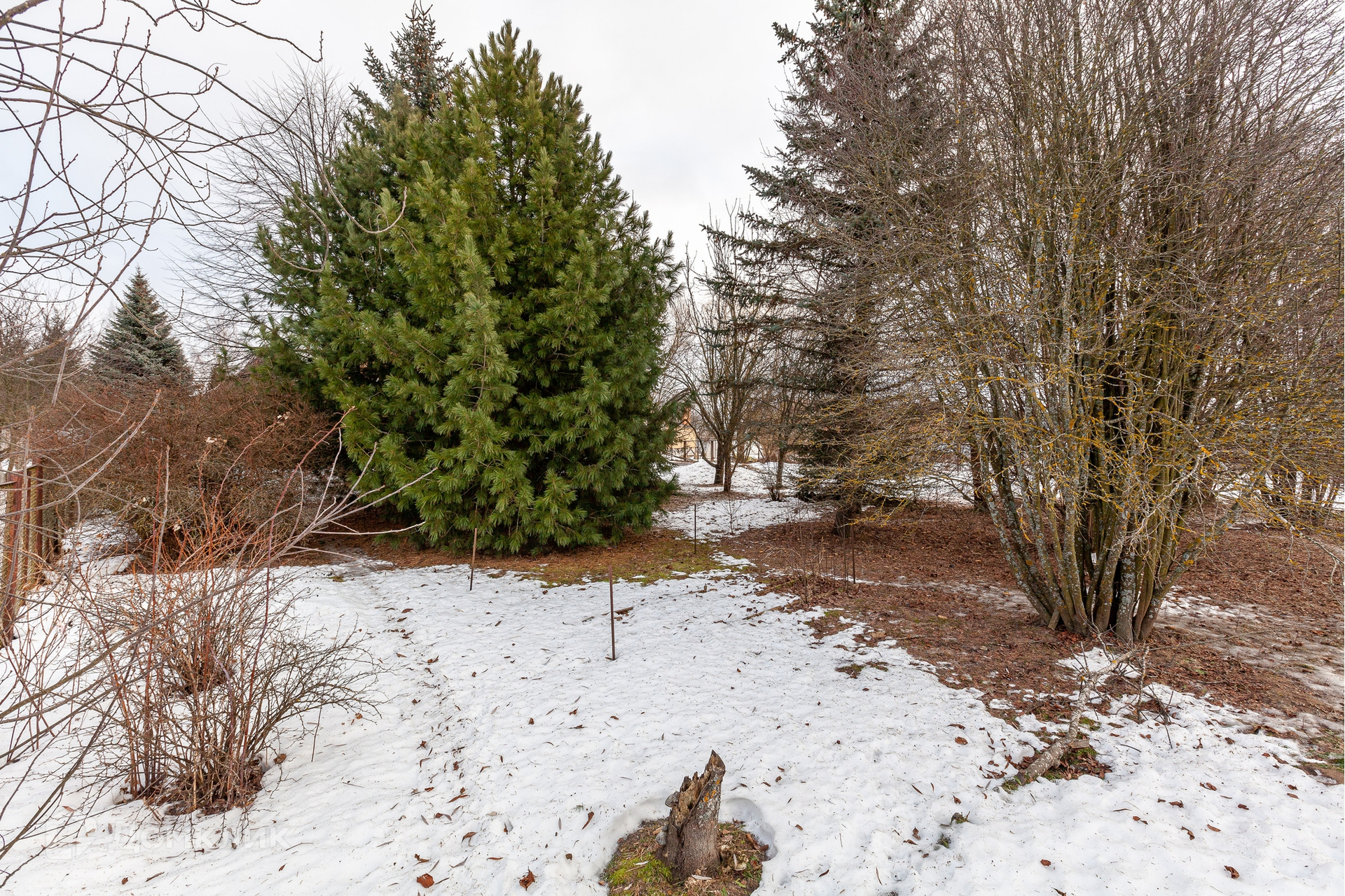 На участке в 21 сотку великолепные голубые ели, можжевельник, кедр, пихты, сосны, под которыми весной расцветают ландыши. Также есть и фруктовые деревья.