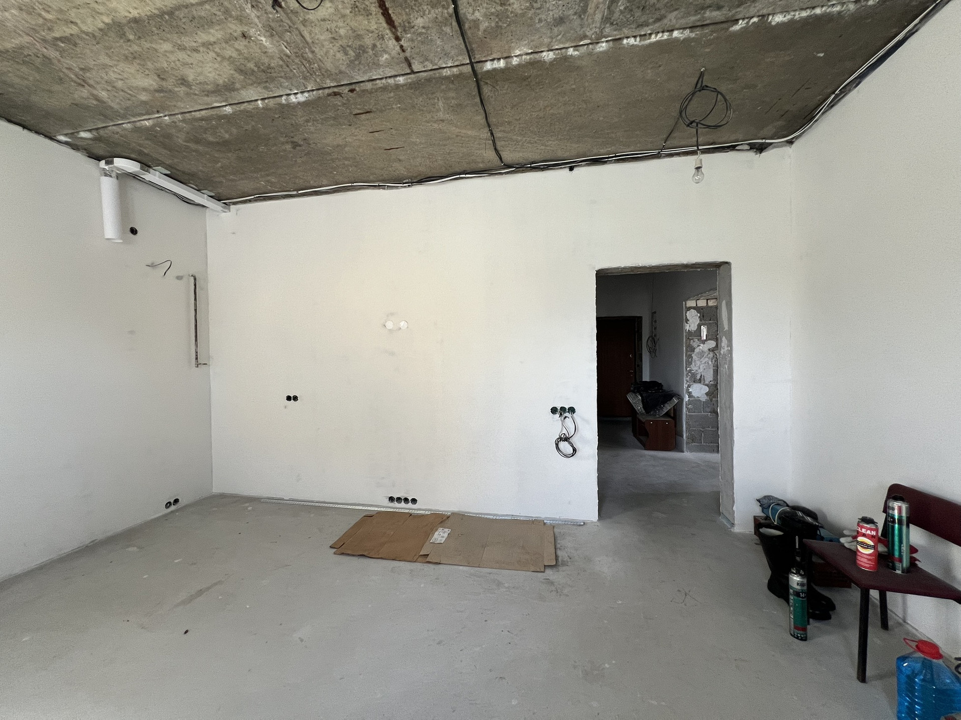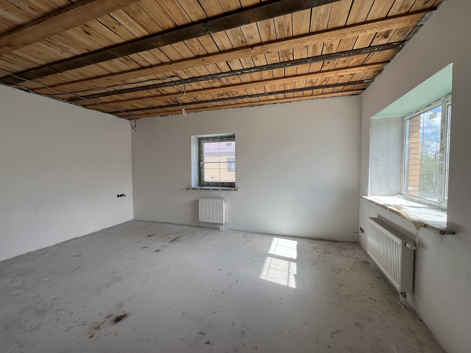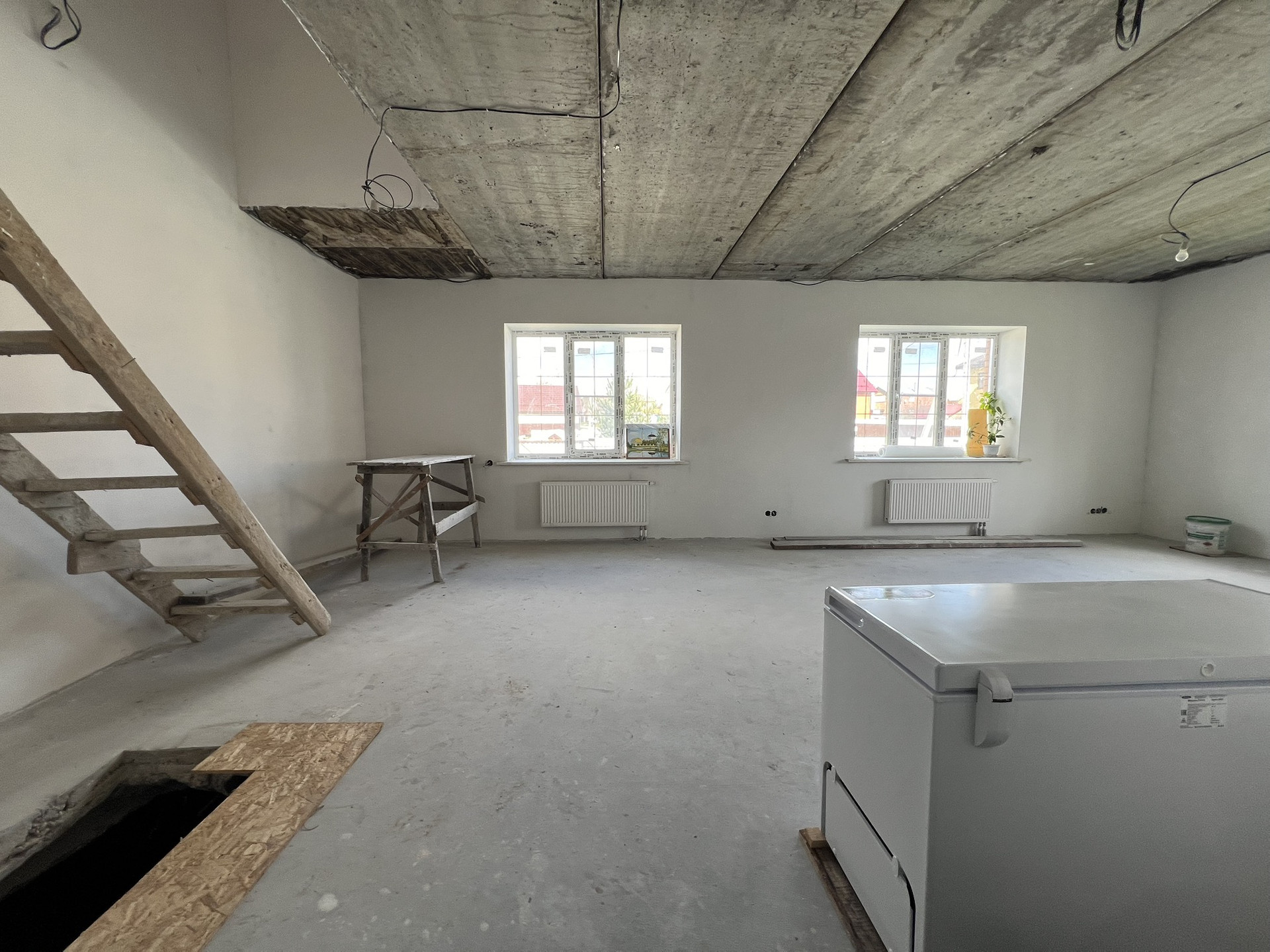 Выполнена разводка коммуникаций, отделка white box, первый этаж - теплый пол (водный).