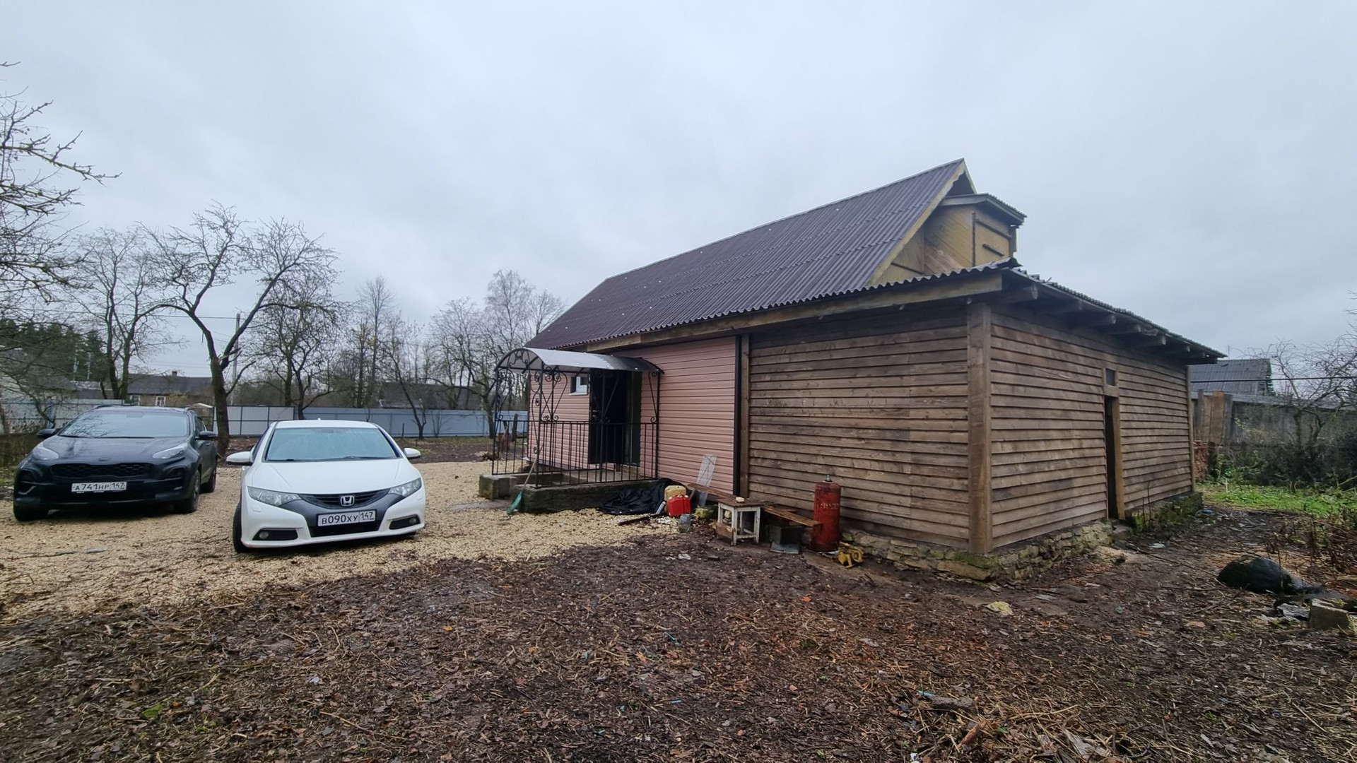 Фундамент – ленточно-бутовый; стены – бревно; крыша - металочерепица, обшит сайдингом.