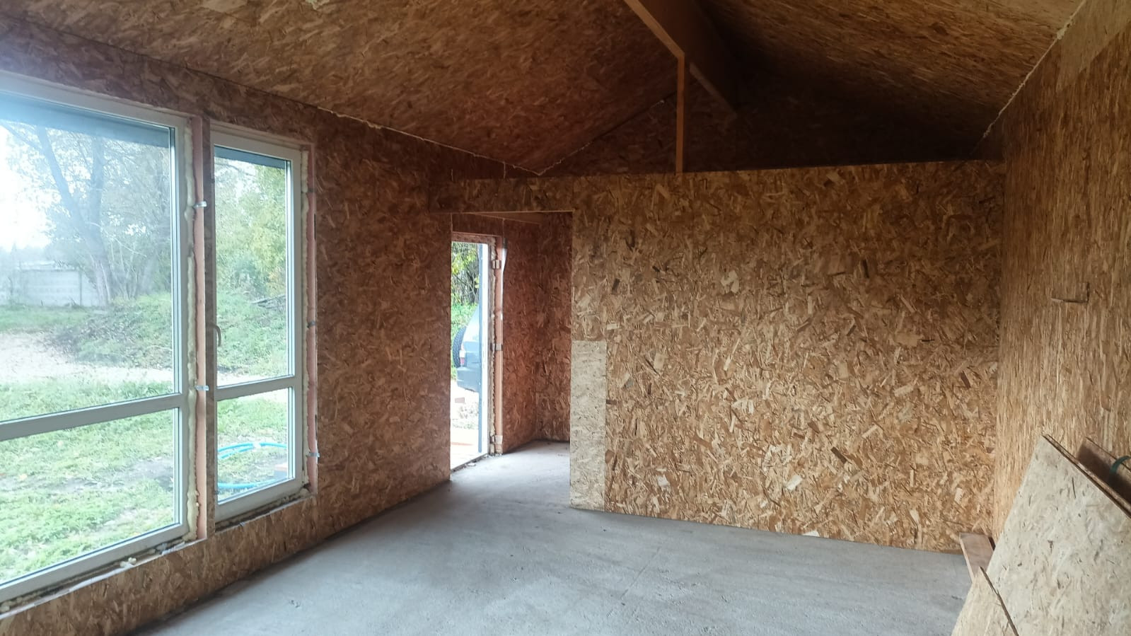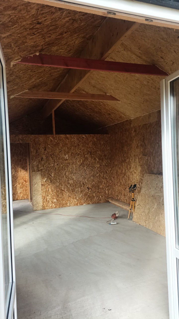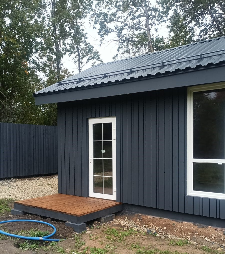 Дом 2023 года постройки, площадью 37,4 кв.м., каркасный, выполнен в скандинавском стиле. Дом стоит на фундаменте(плита), в доме сделана черновая отделка – зашит OSB плитами. Дом находиться на краю участка, построен по всем строительным нормам, поэтому есть возможность построить еще один дом большей площадью.