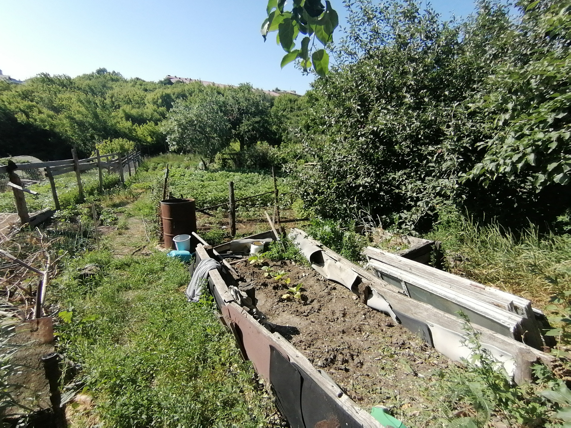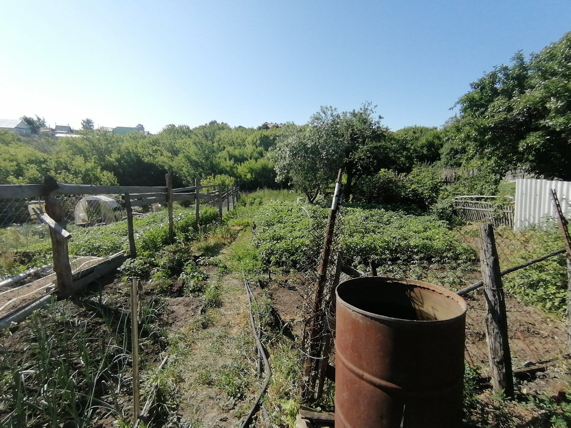 На участке сарай с погребом, гараж. Из насаждений: малина, яблоня несколько сортов, виноград.