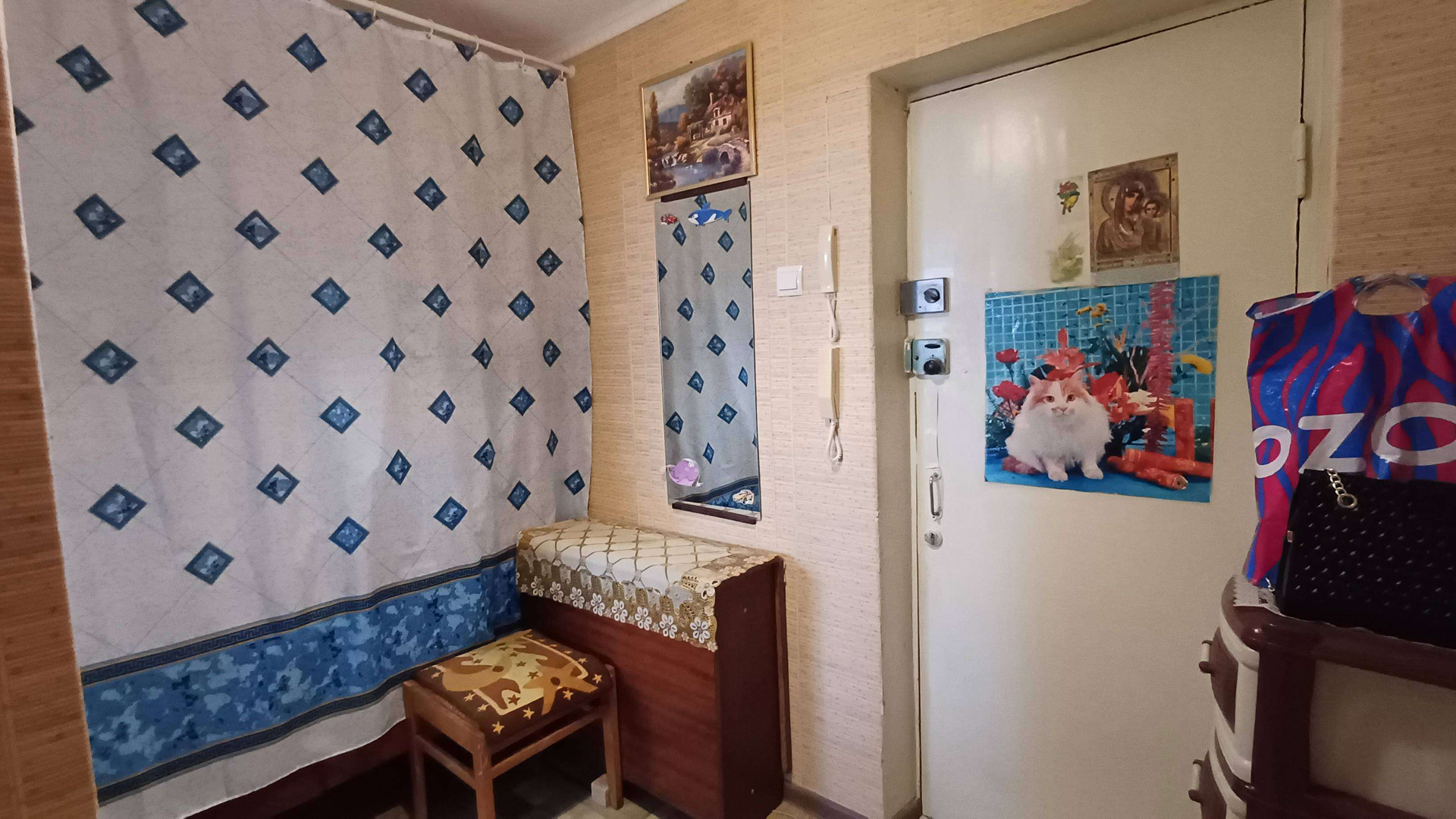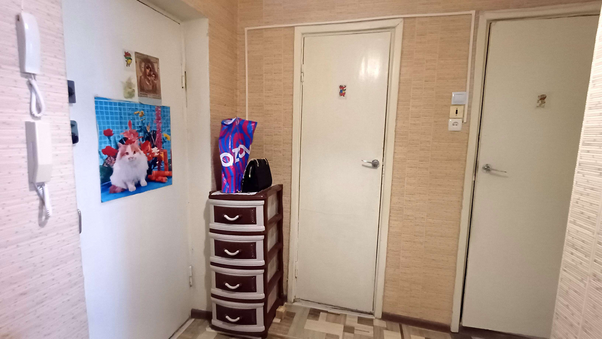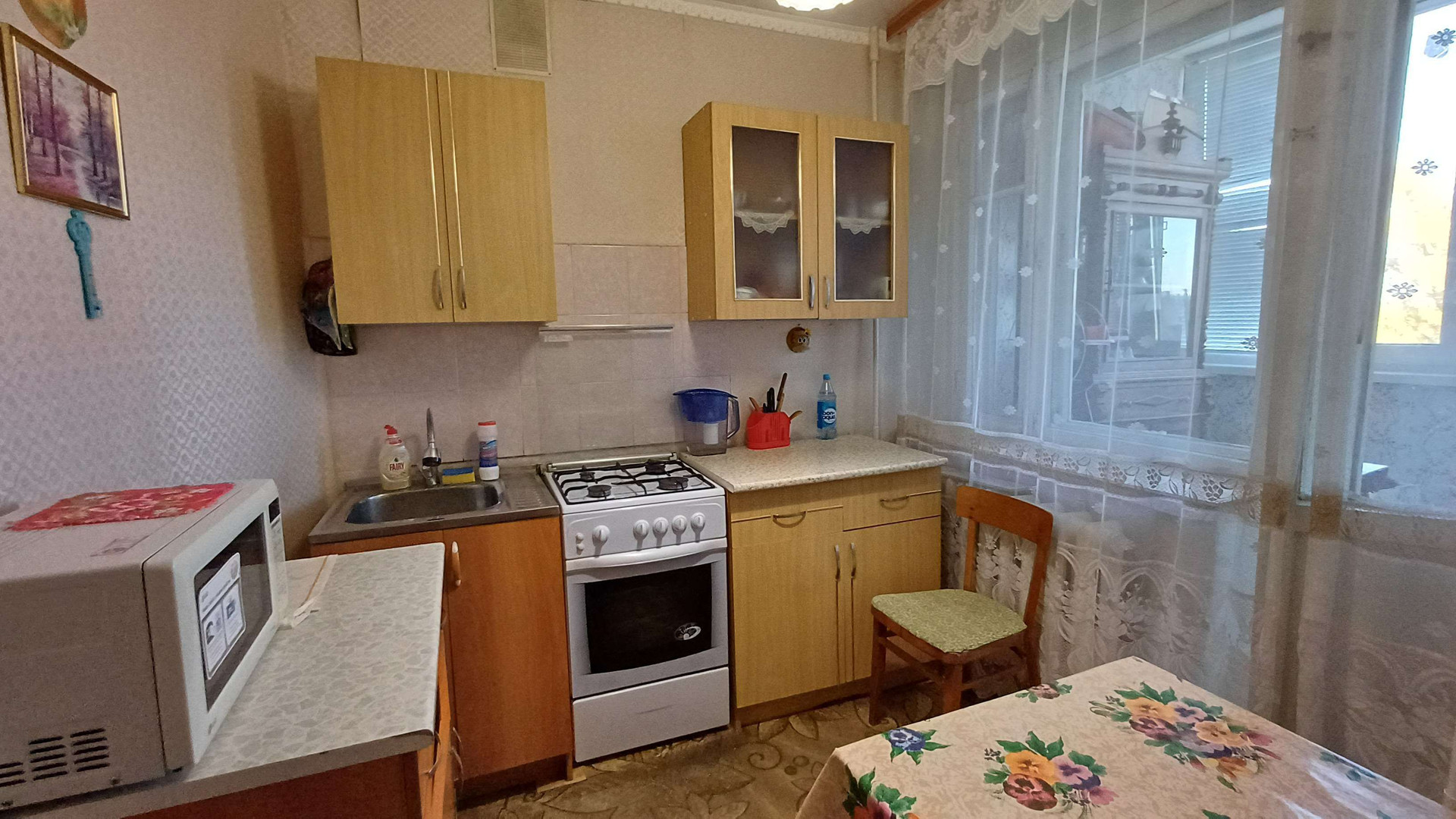 Кирпичный дом, тёплый, с домофоном на входе в подъезд и на этаже. В квартире чисто, но требуется небольшой косметический ремонт. На полу линолеум, в комнате пластиковое окно, на кухне – деревянное. Соседи хорошие и спокойные.