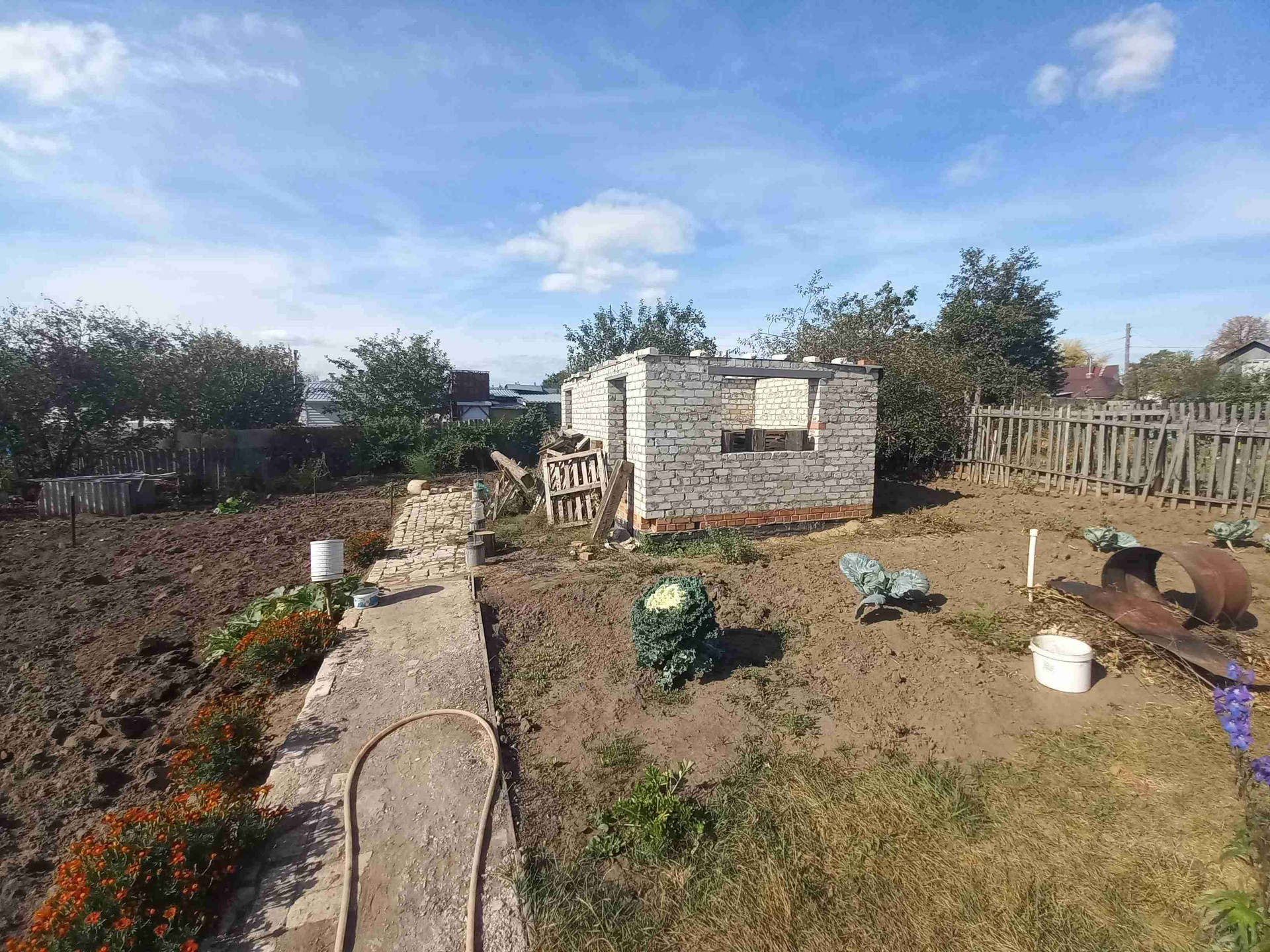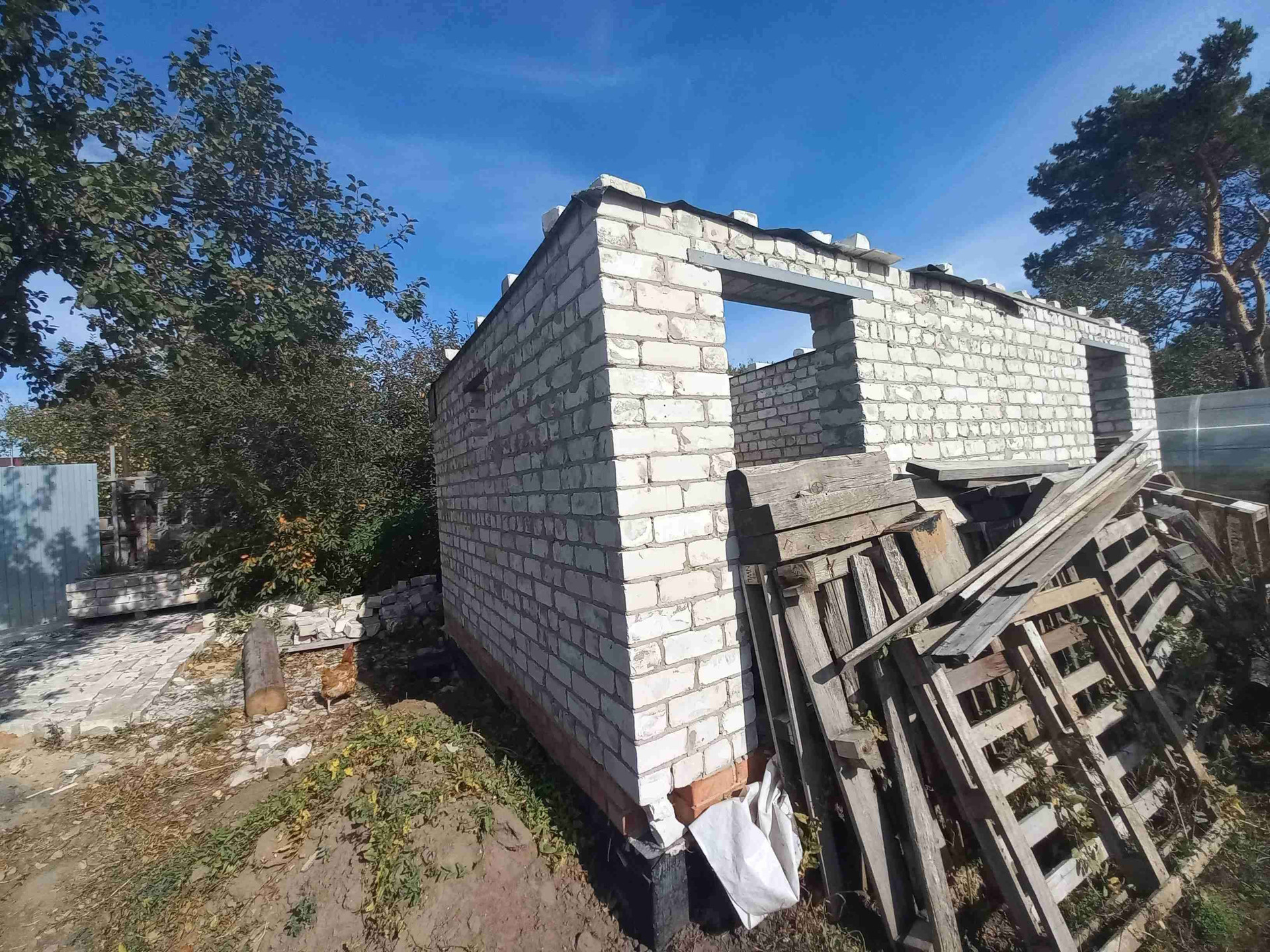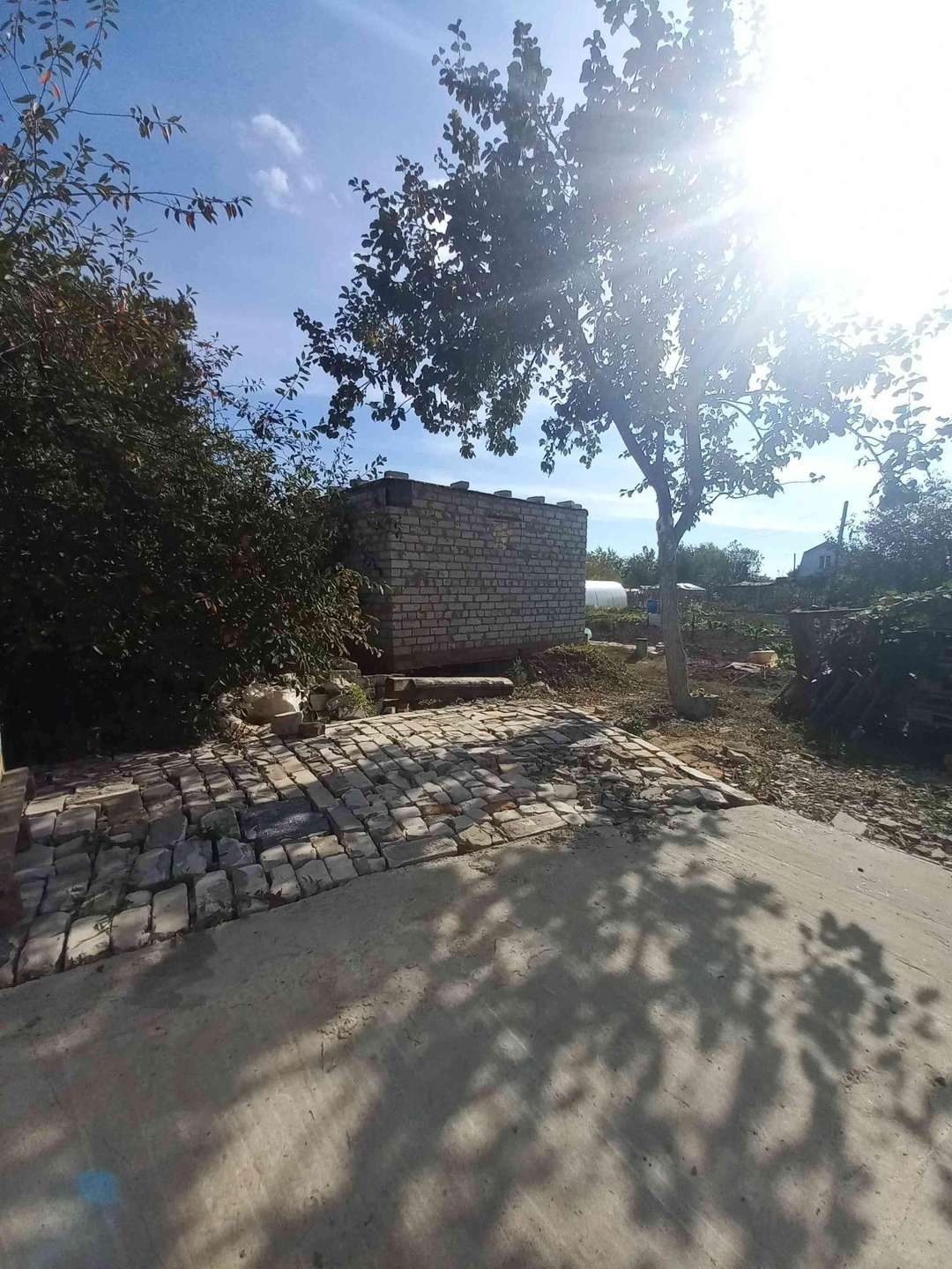 Домик деревянный с новой крышей из профнастила, есть второй недостроенный новый кирпичный домик-баня (кирпичная кладка на фундаменте).