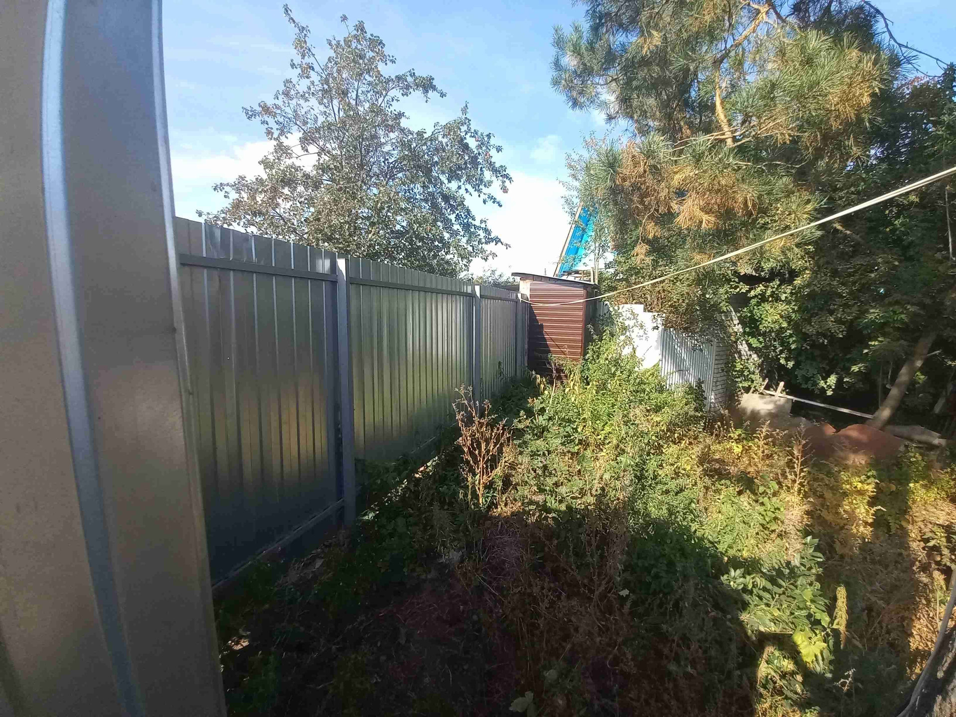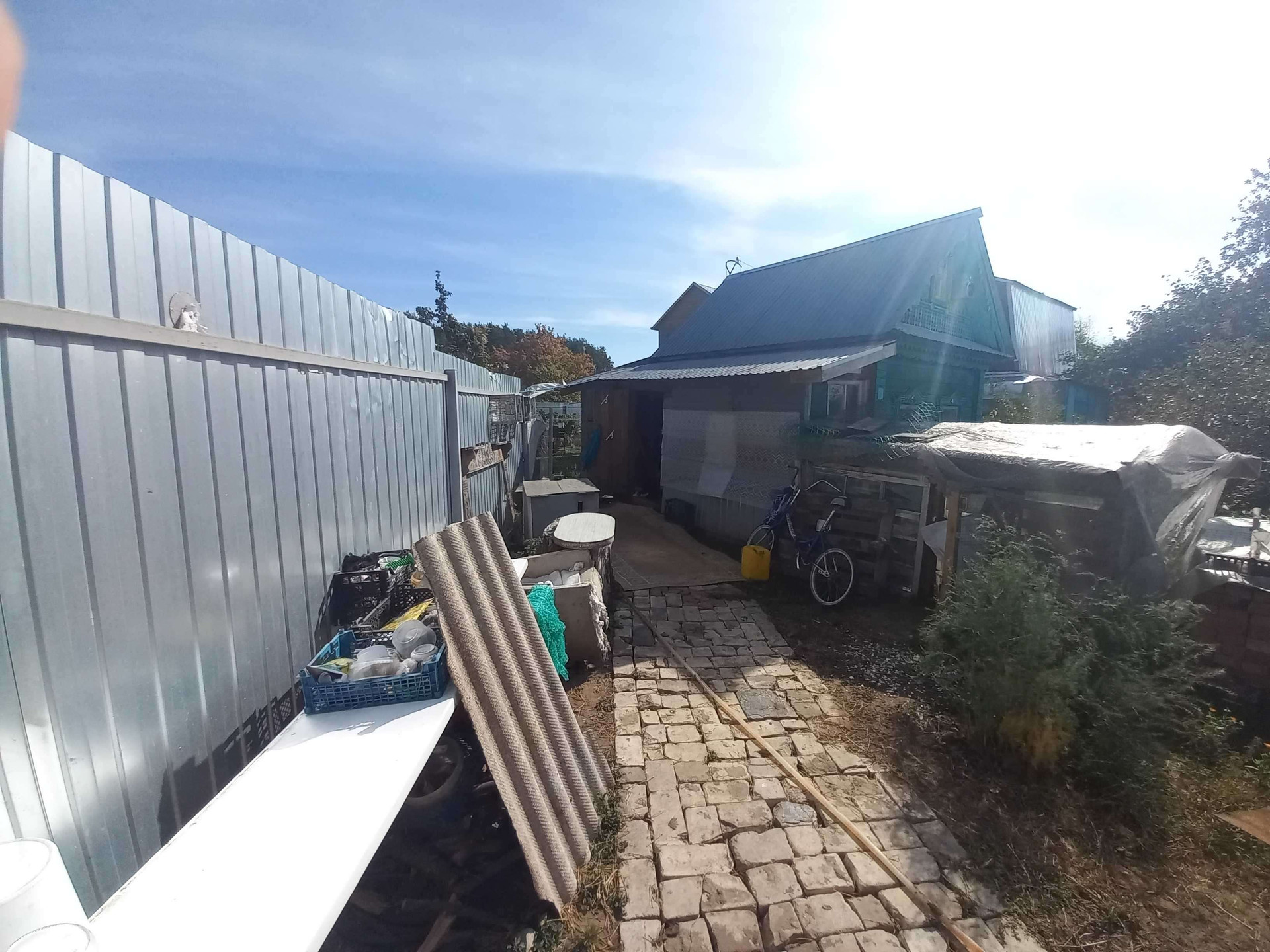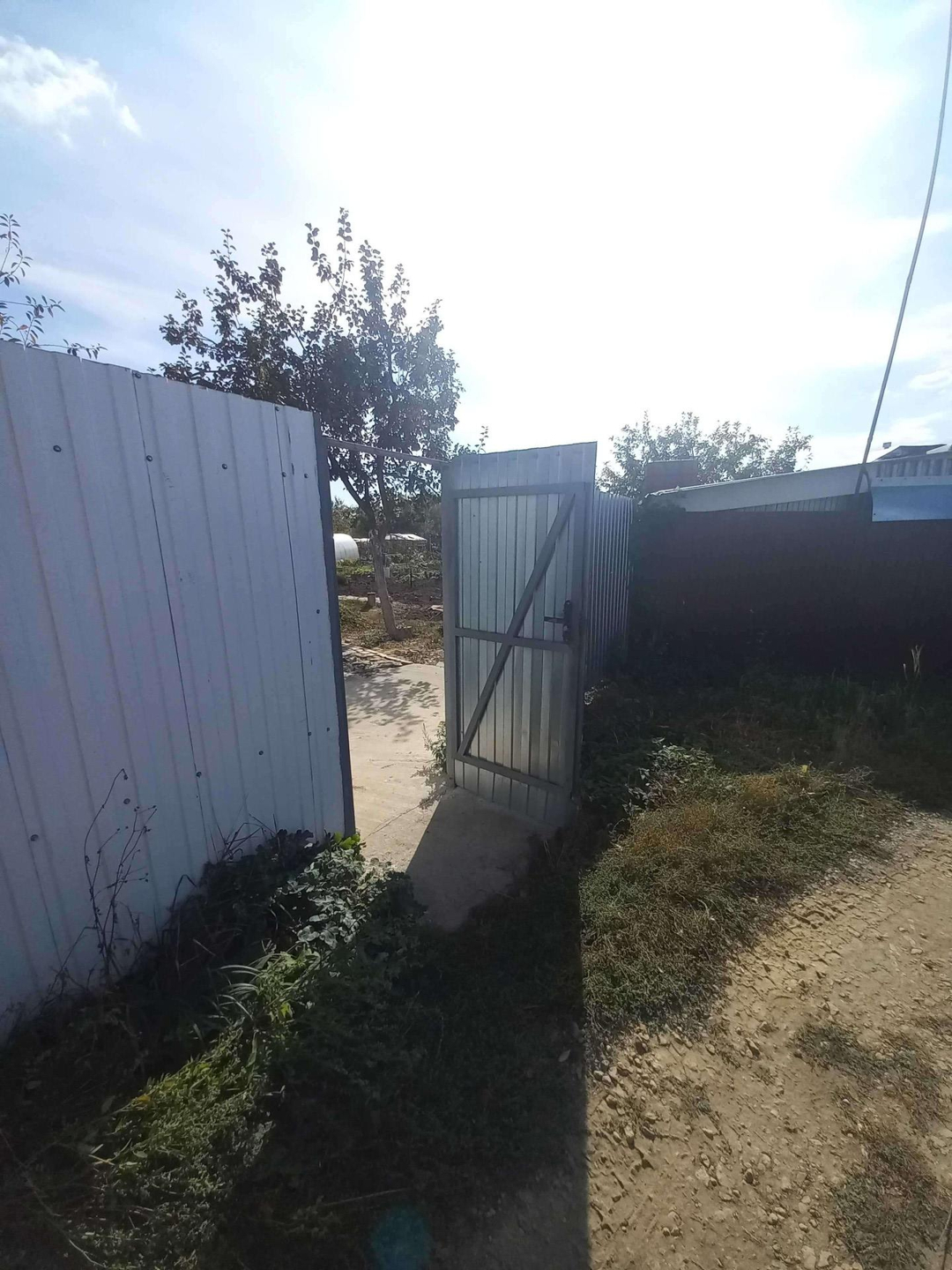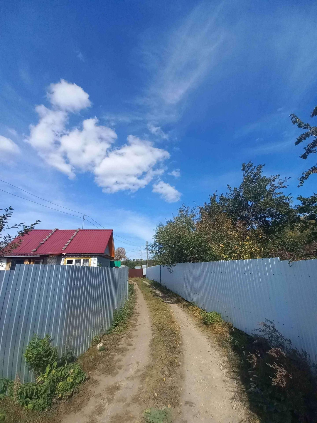 Участок огорожен забором из профнастила, есть ворота и заезд внутрь участка под машину .