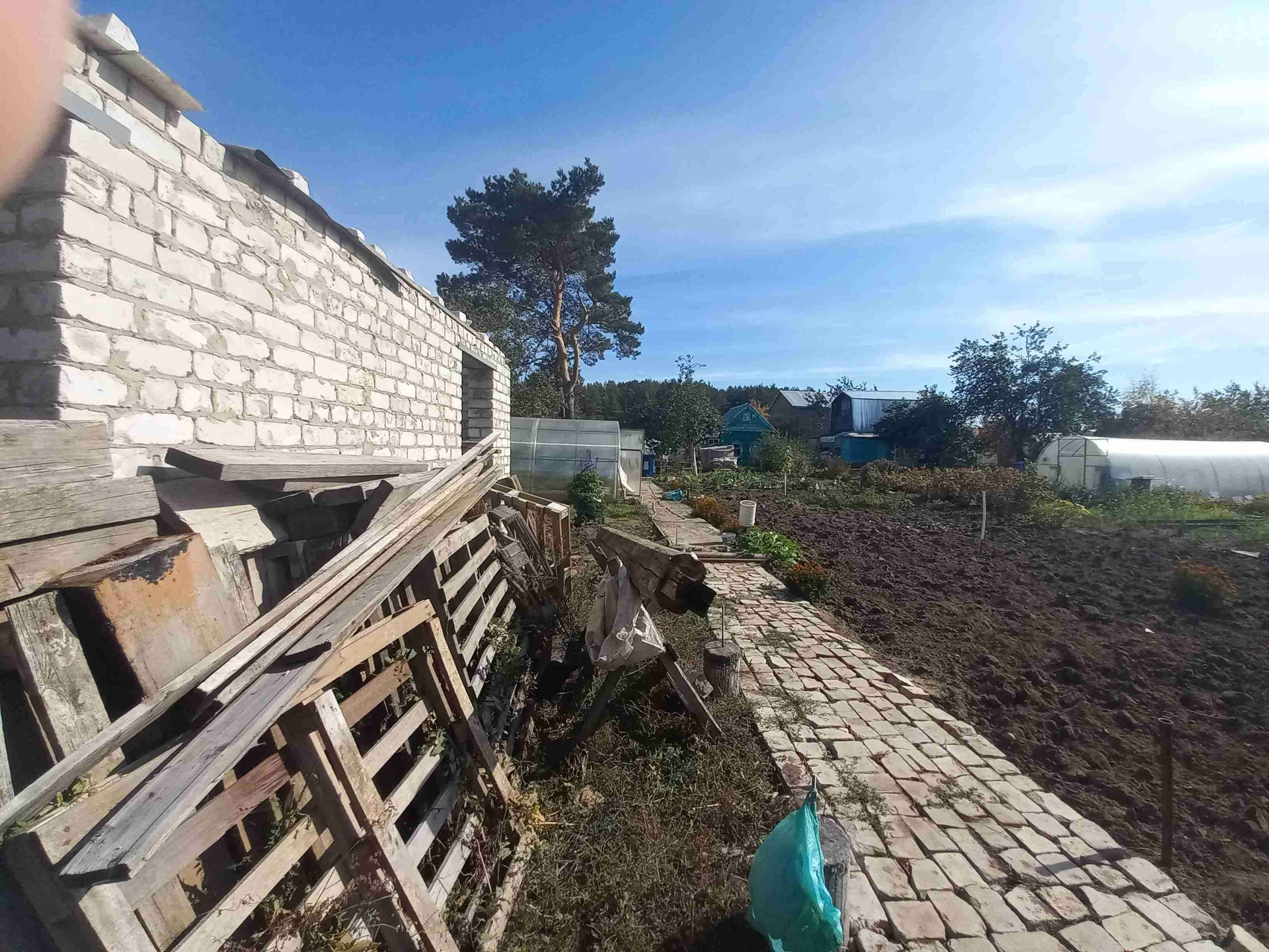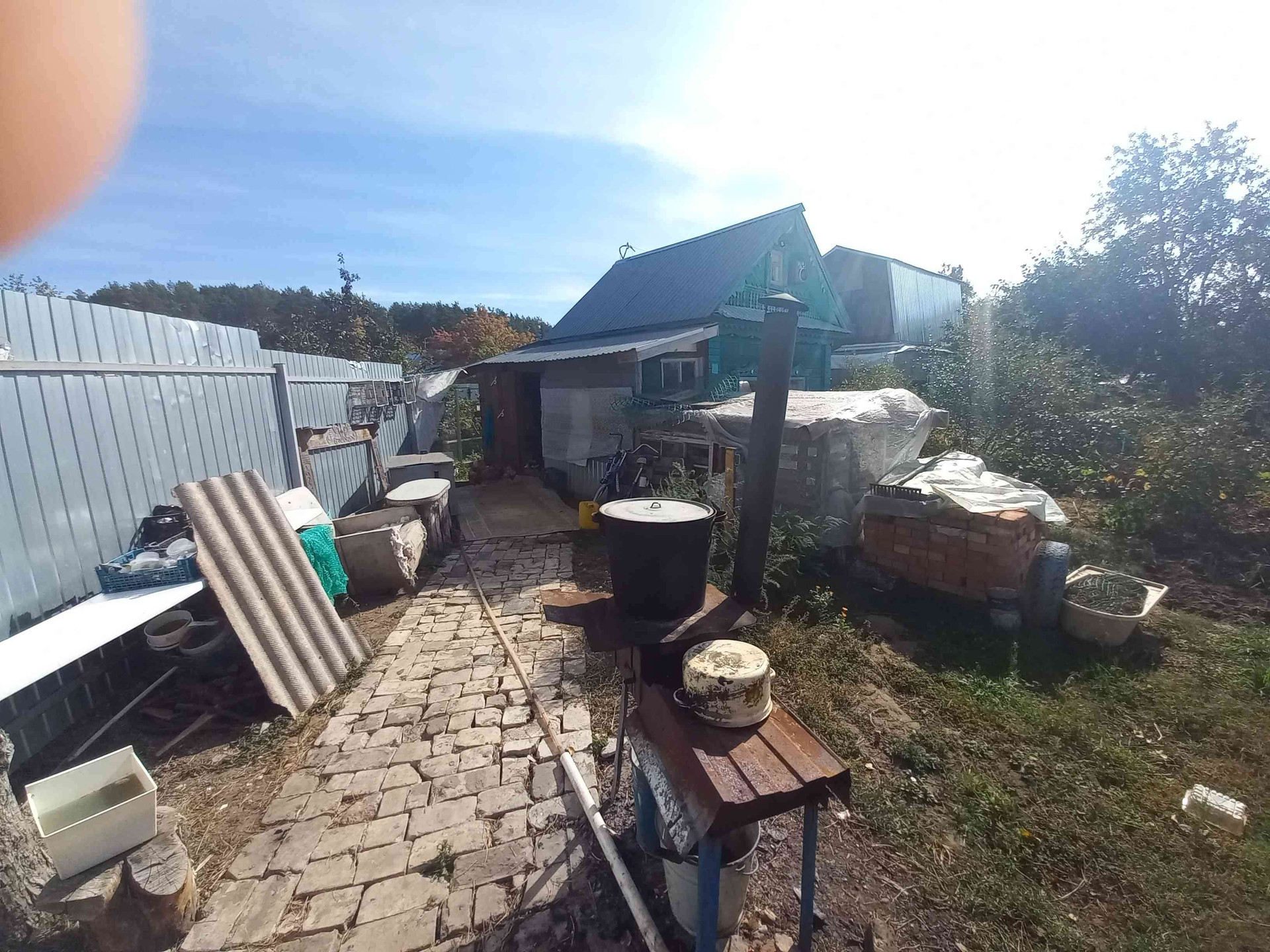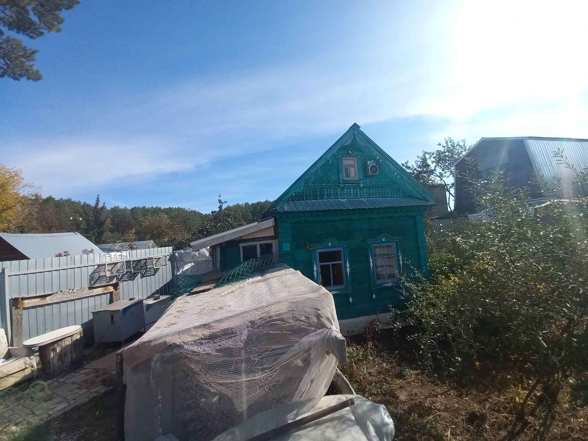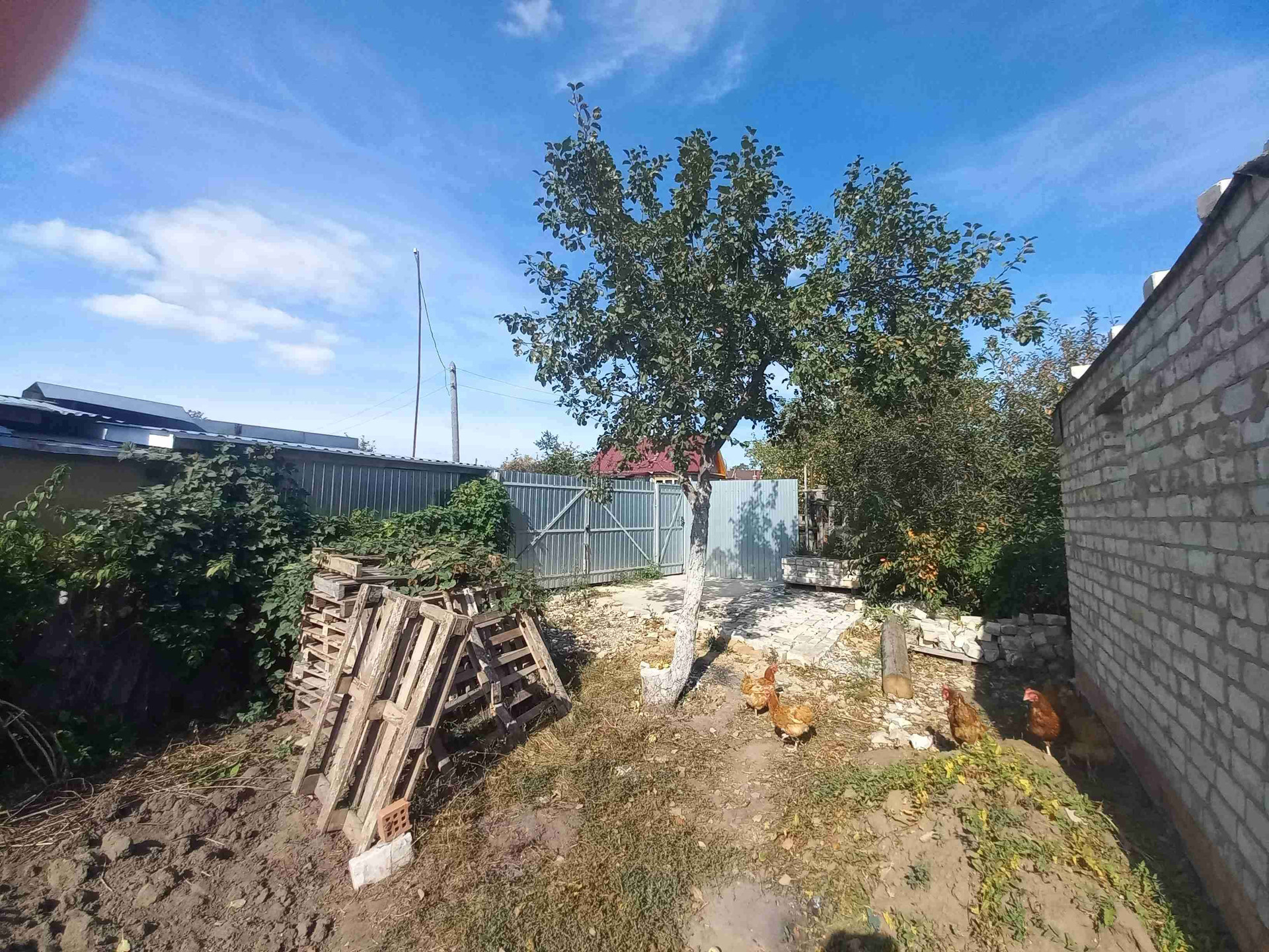 Участок огорожен забором из профнастила, есть ворота и заезд внутрь участка под машину .