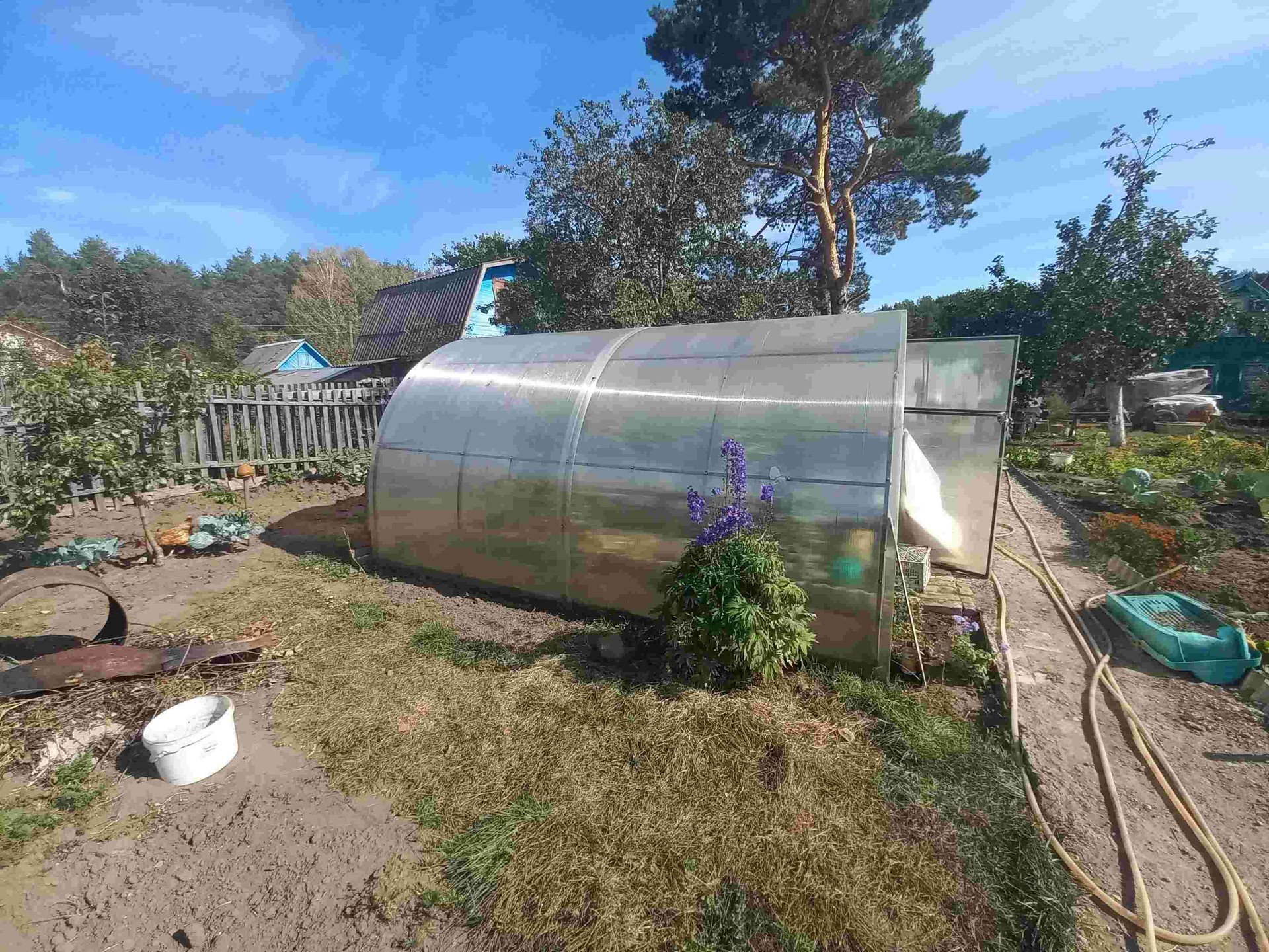 На участке есть водопроводная скажина (насос в подарок) с чистейшей питьевой водой, есть теплица из поликарбоната.