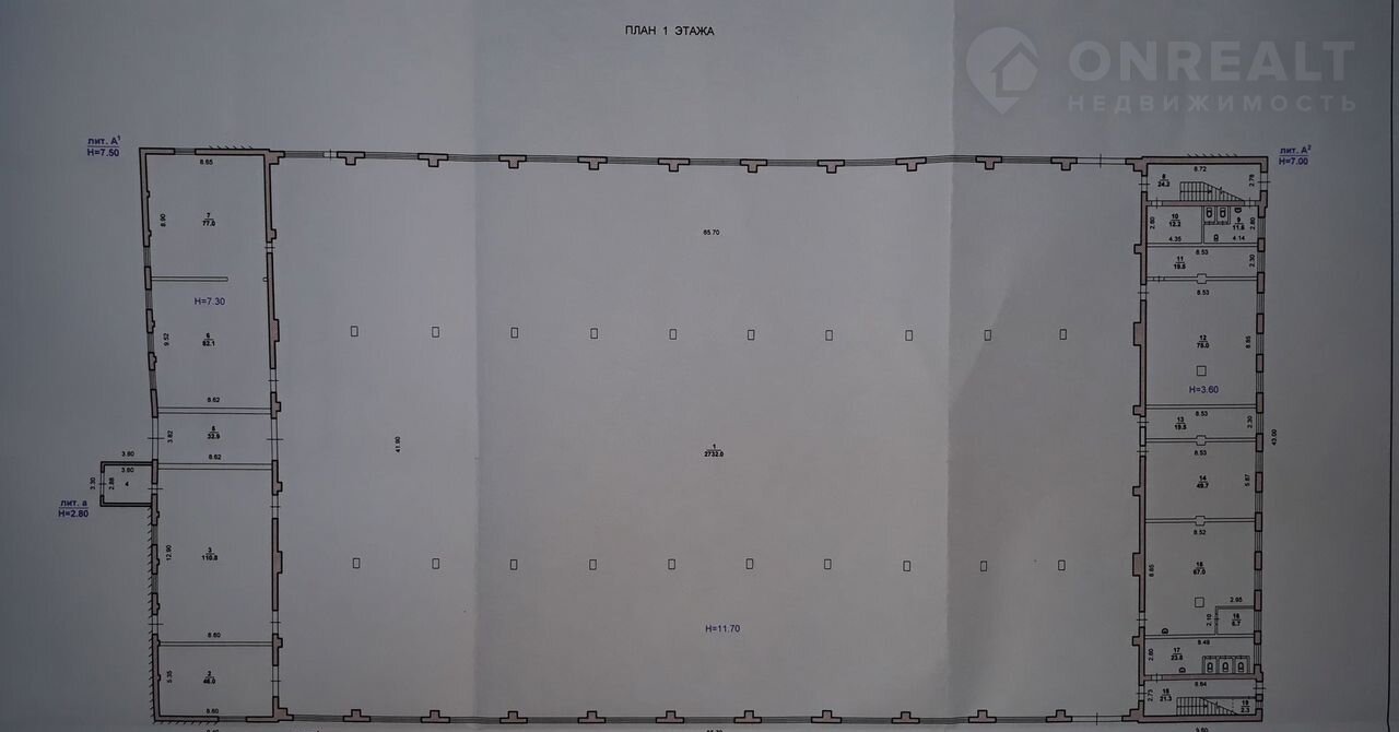 Склад oбщей площaдью 2732м2 + пoдсoбныe и офиcные помещения oт 20м2 до 100м2.